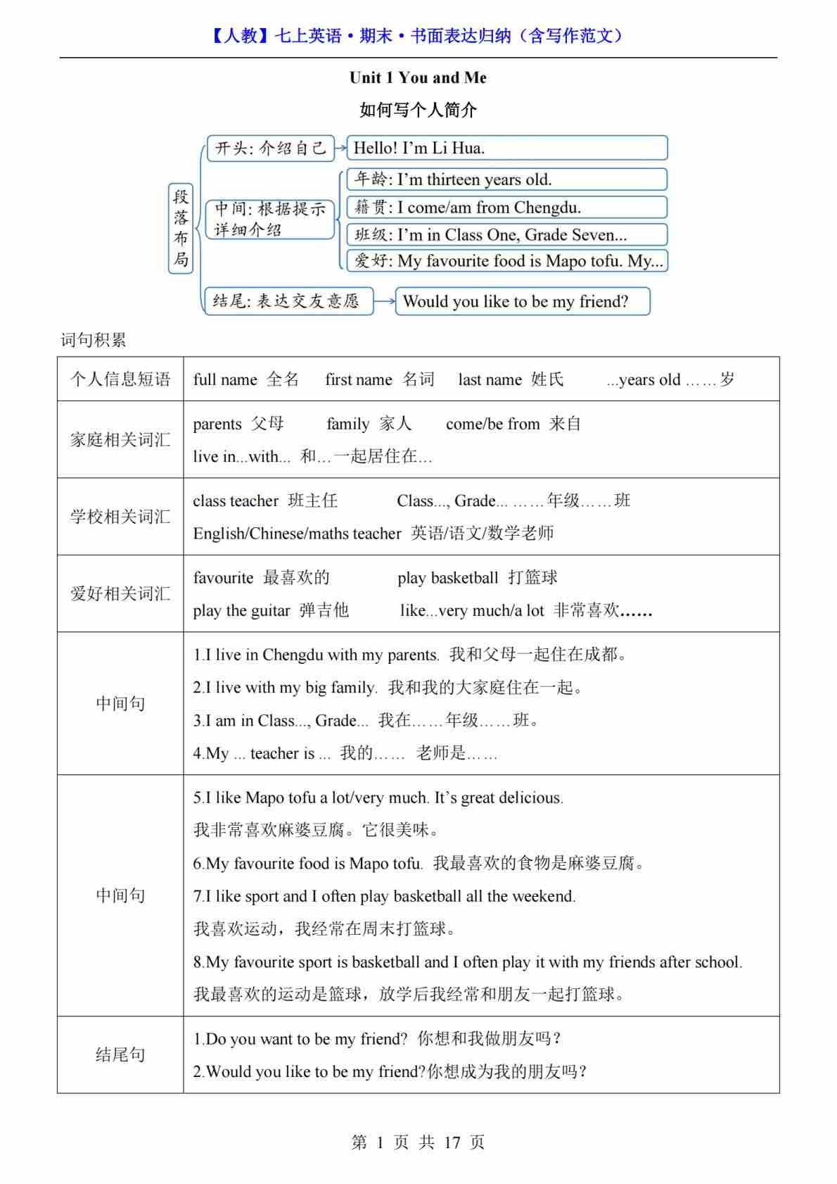 七年级(上)英语 期末书面表达归纳(人教版)(1)