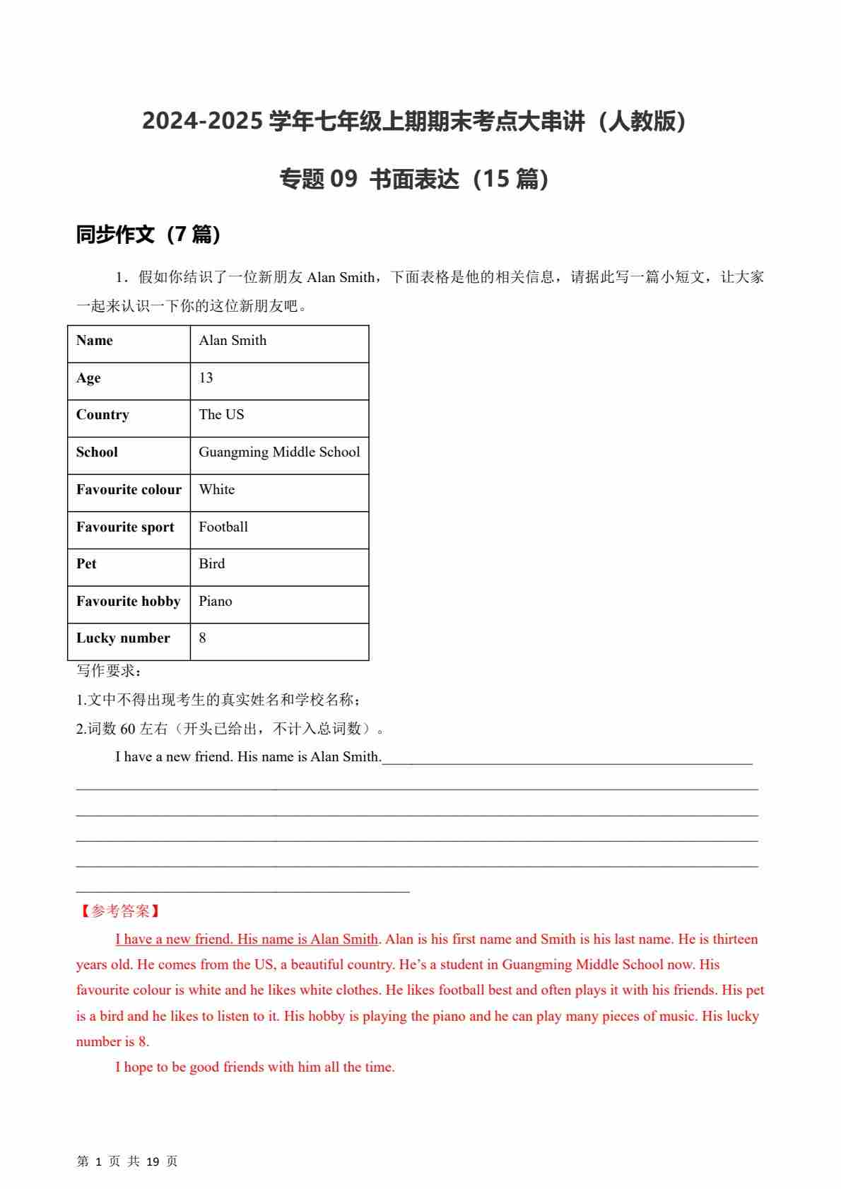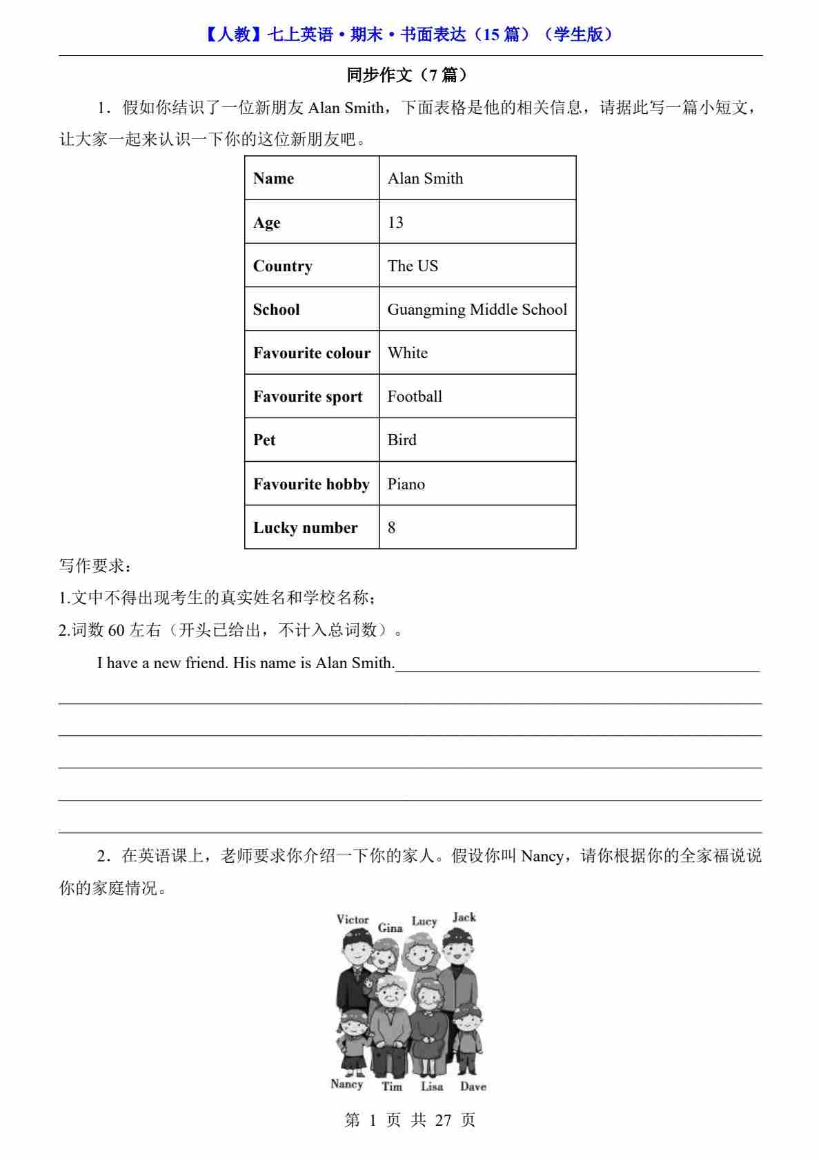 【人教】七上英语期末书面表达15篇
