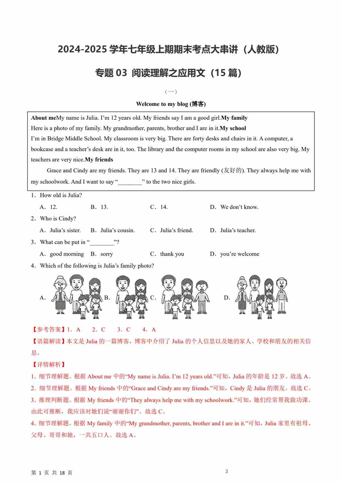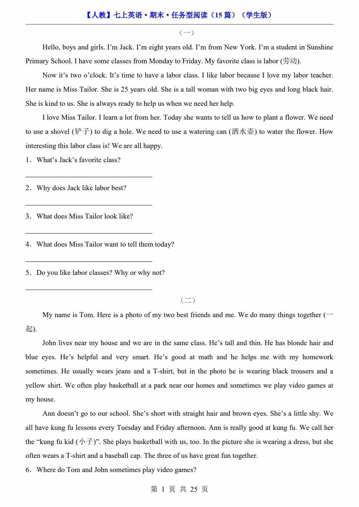 【人教】七上英语期末阅读理解之记叙文15篇