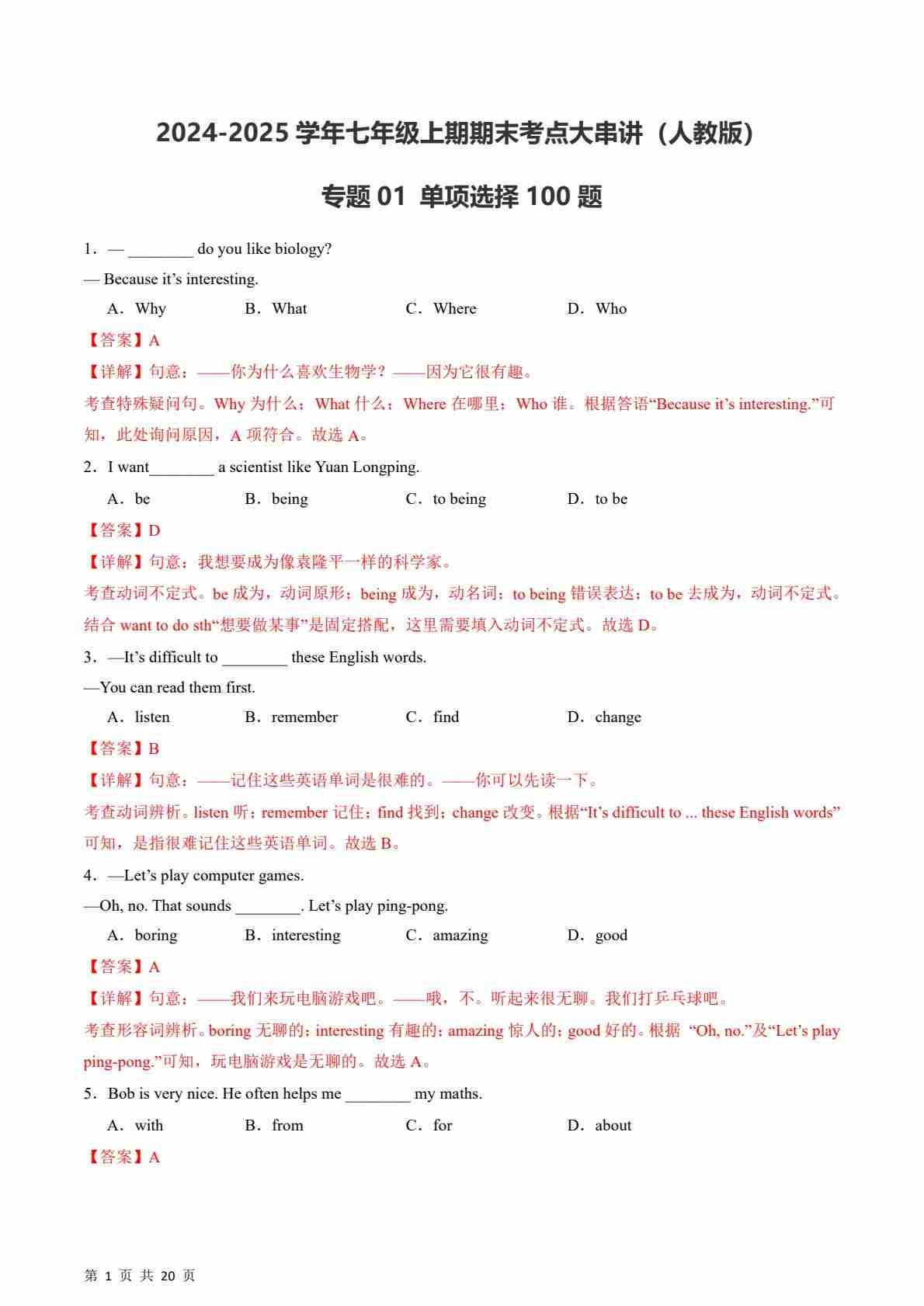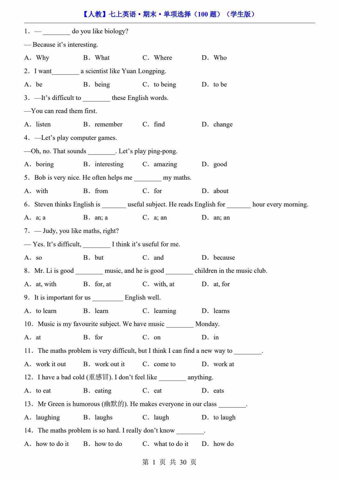 【人教】七上英语期末单项选择100题