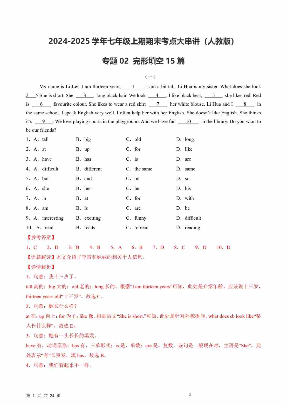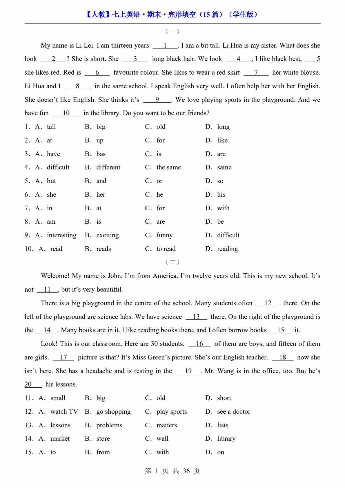 【人教】七上英语期末完形填空15篇