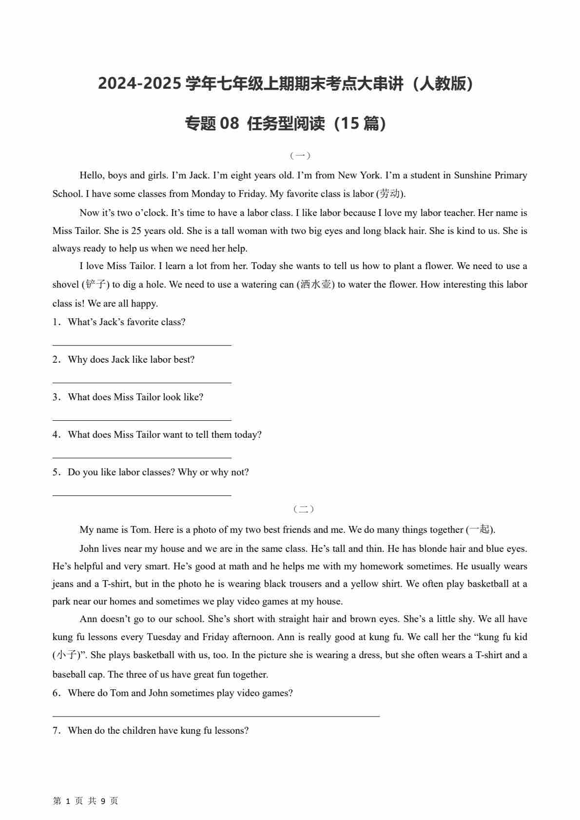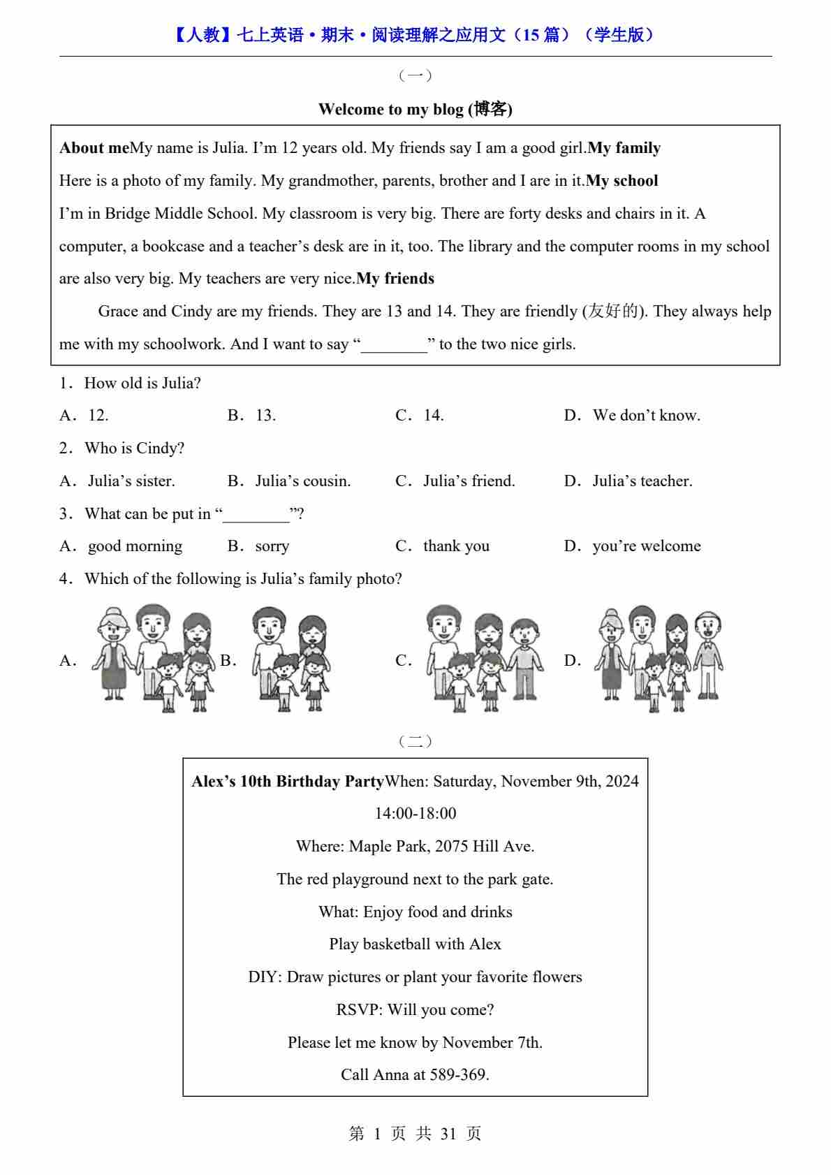 【人教】七上英语期末任务型阅读15篇