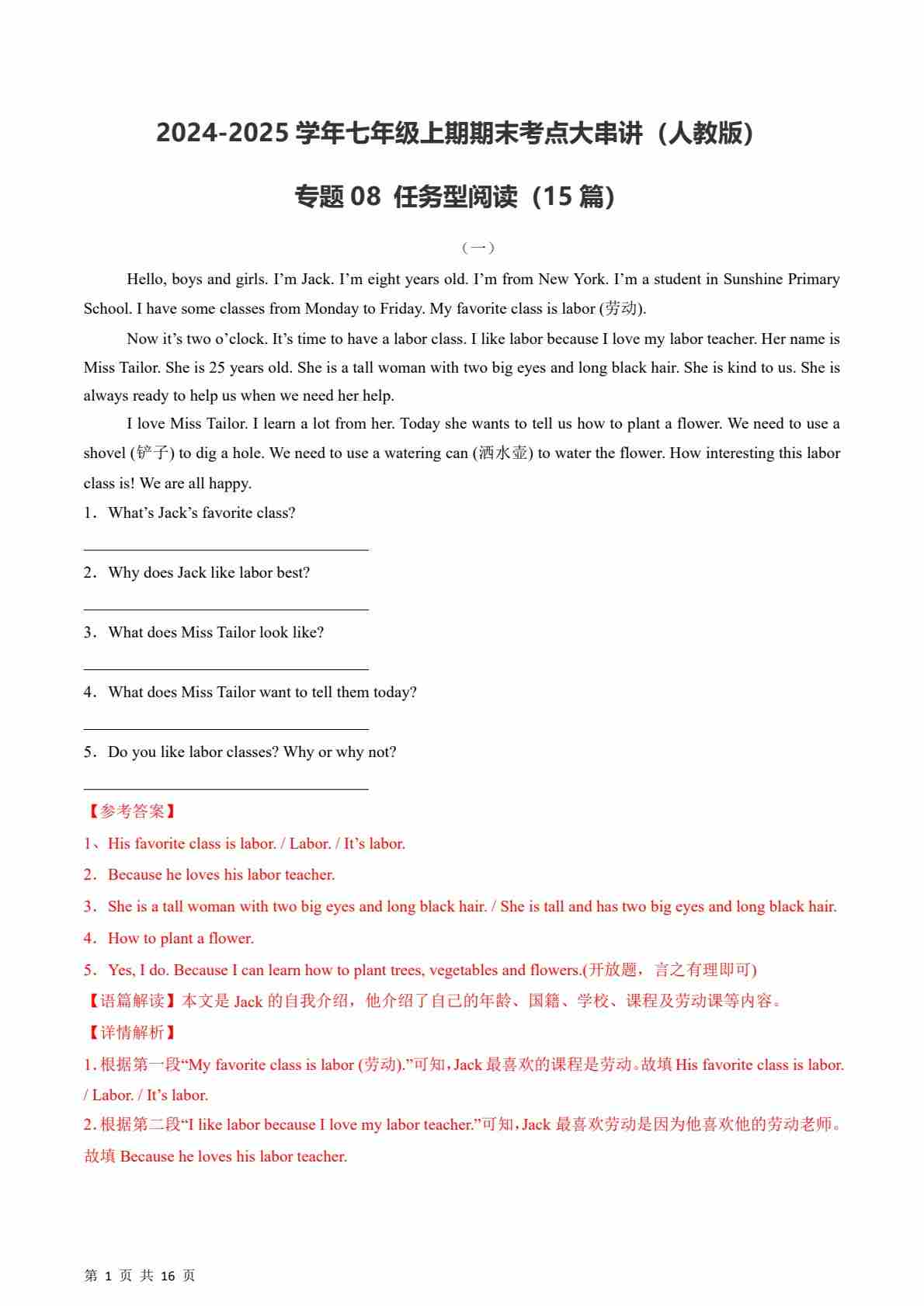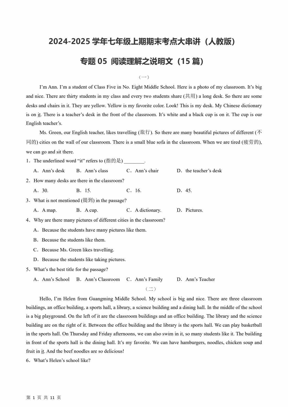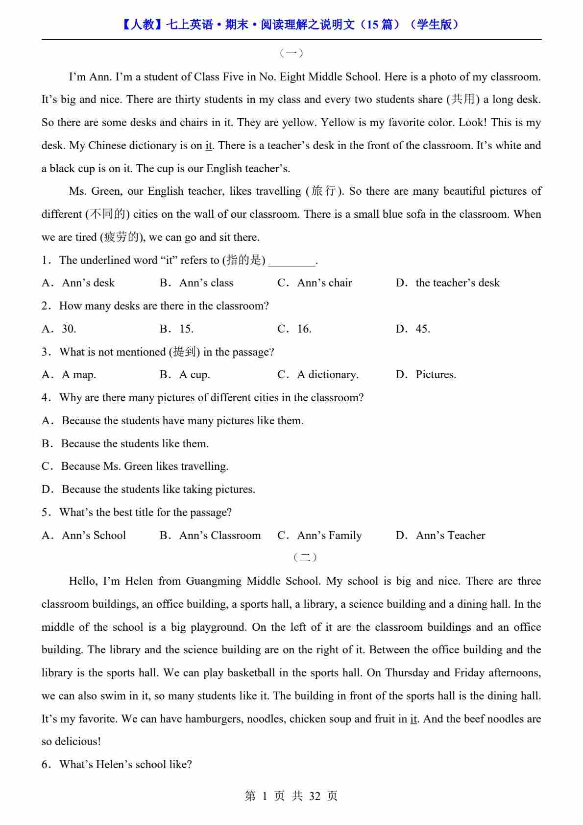 【人教】七上英语期末阅读理解之说明文15篇