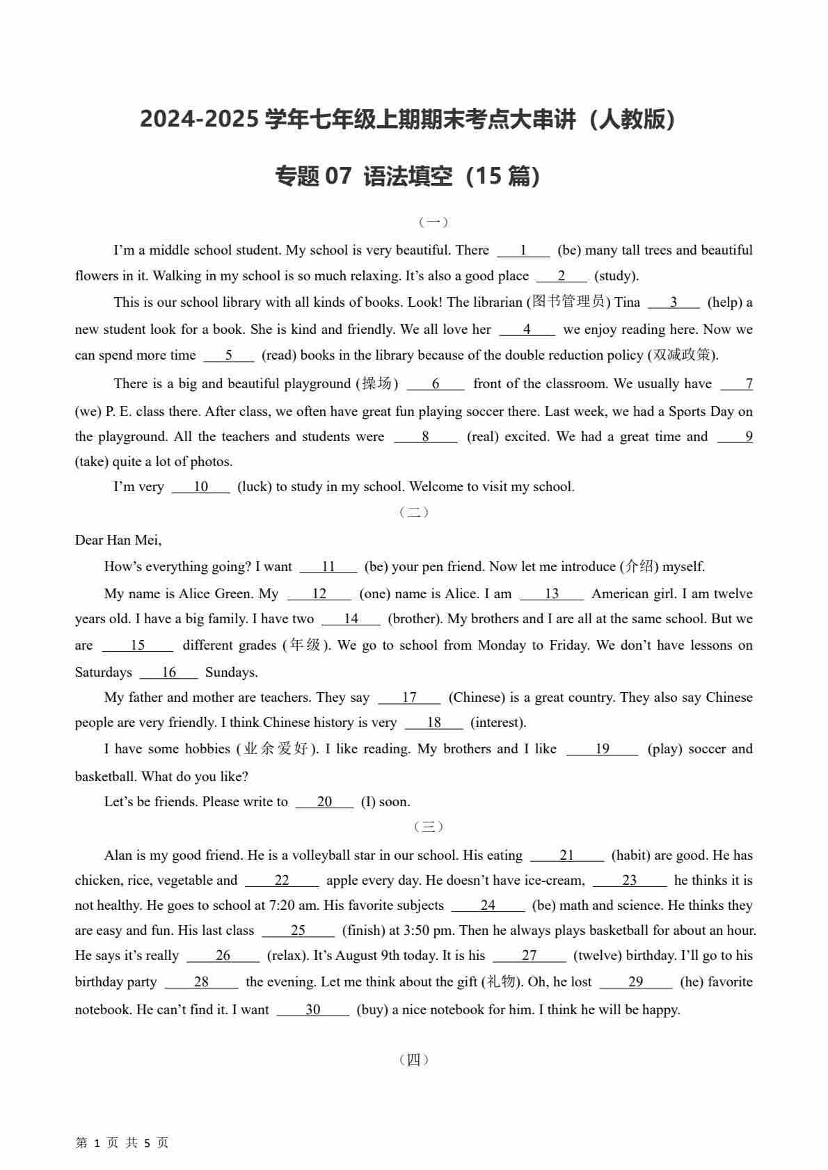 专题07 语法填空 【期末必刷15篇】(原卷版)