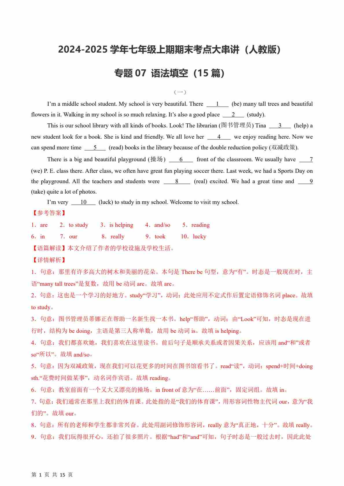 专题07 语法填空 【期末必刷15篇】(解析版)