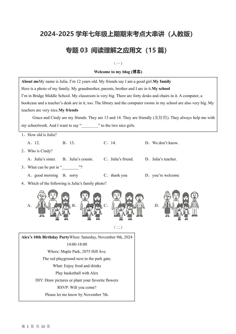【人教】七上英语期末阅读理解之应用文15篇