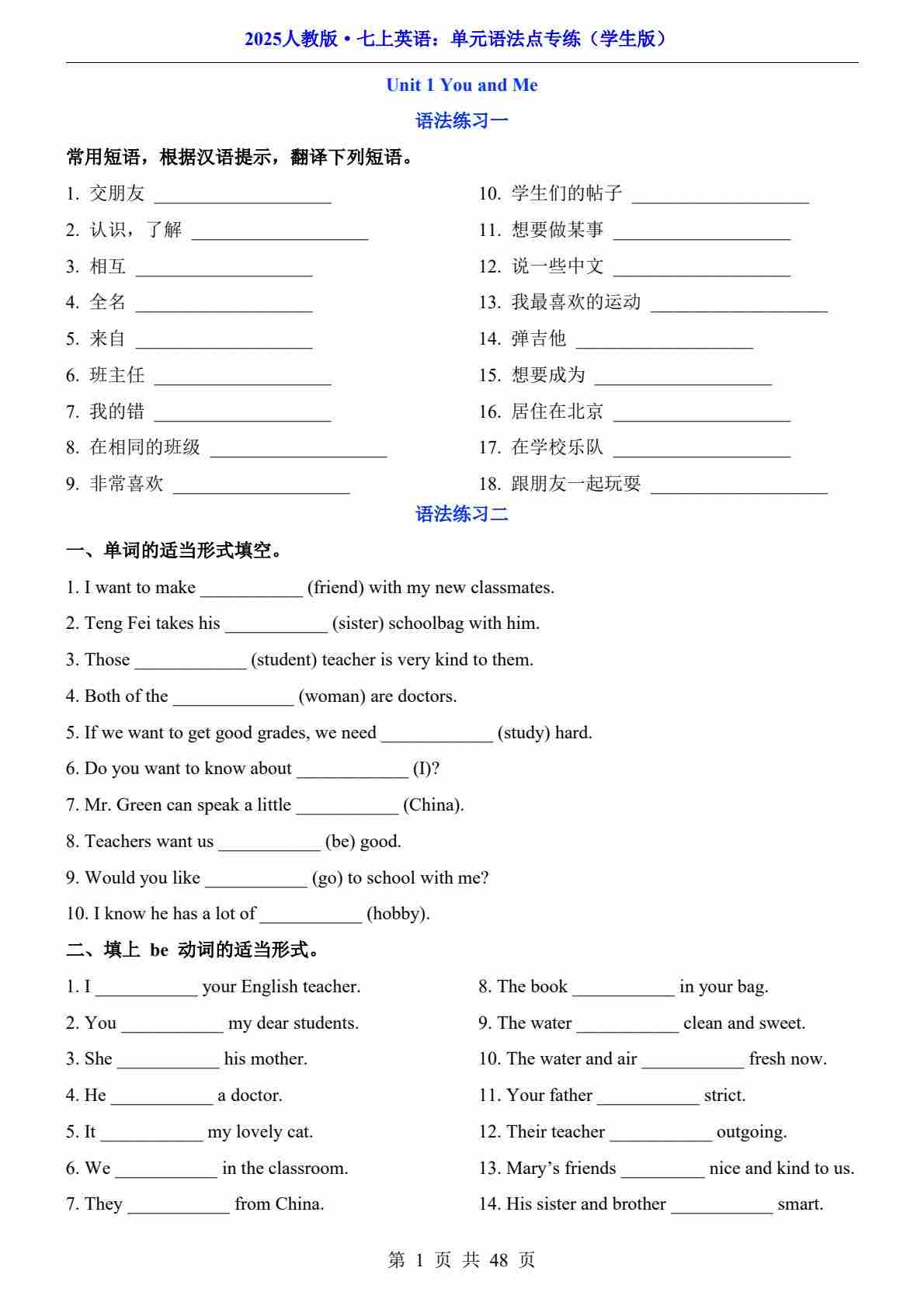 【人教】七上英语单元语法点专项练习(1)