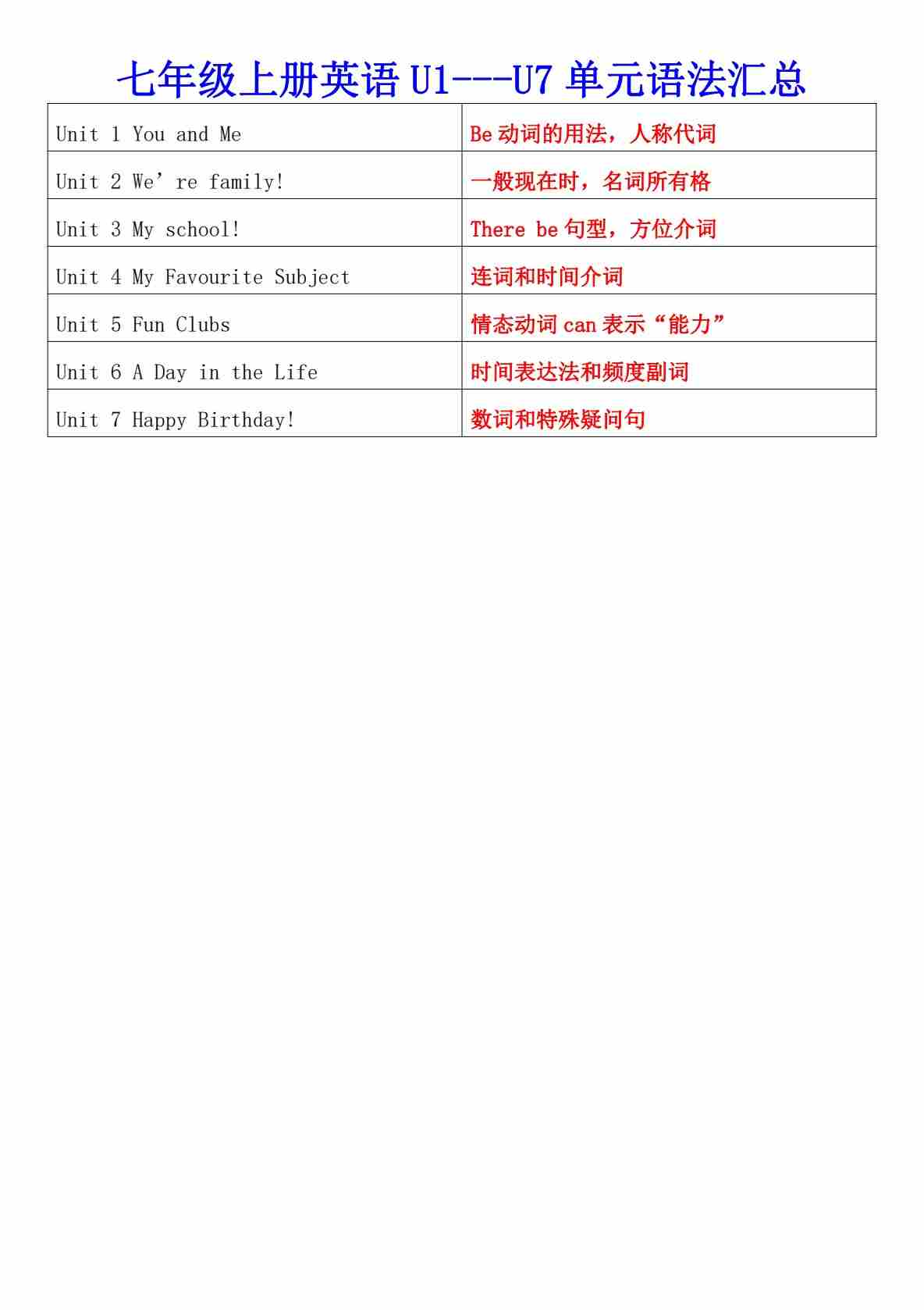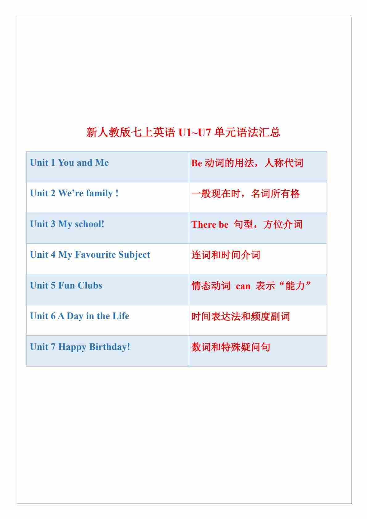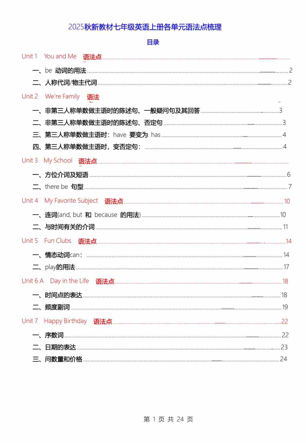 Unit1-7单元语法点梳理 2025学年人教版英语七年级上册