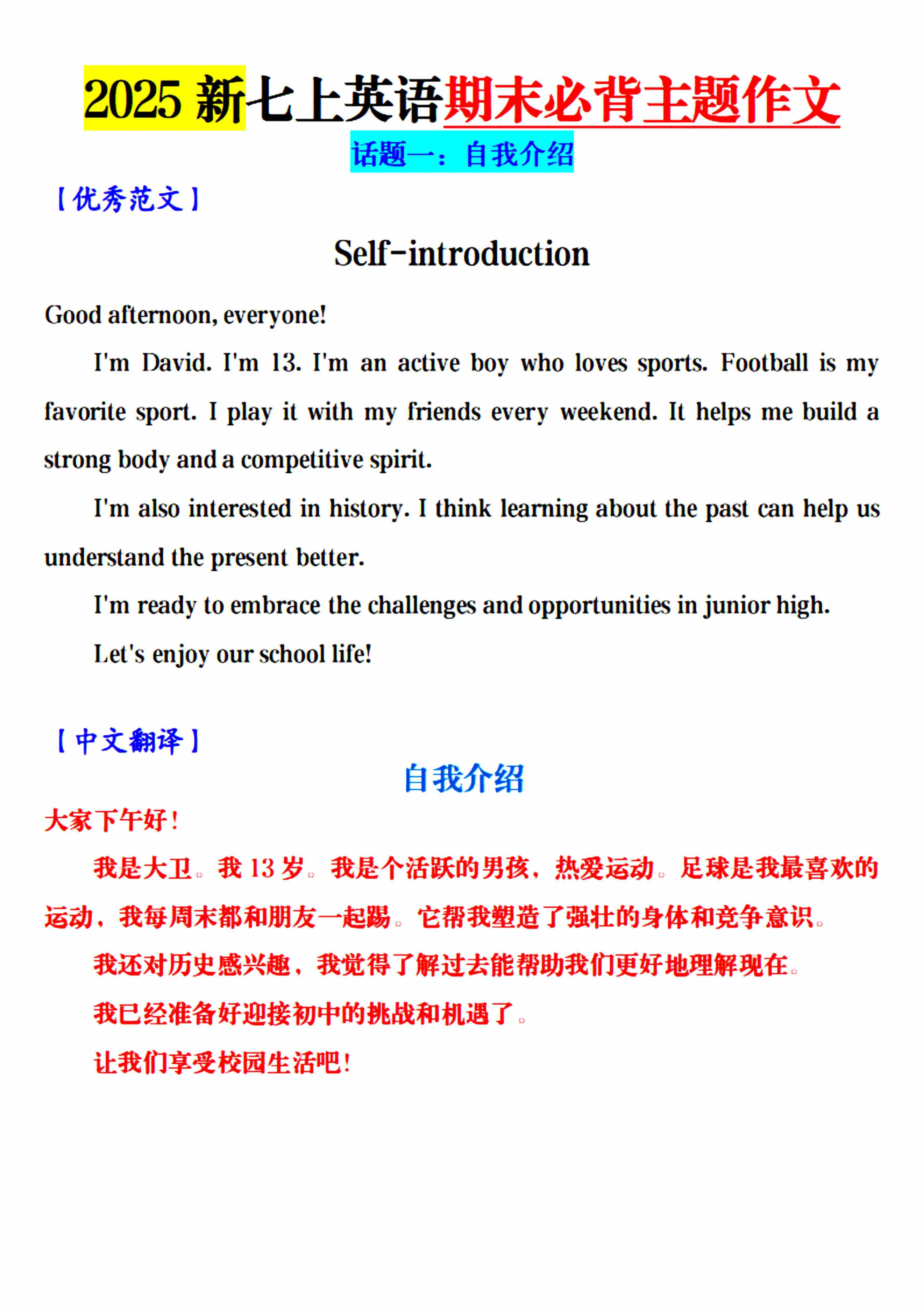 2025新七上英语期末必背主题作文