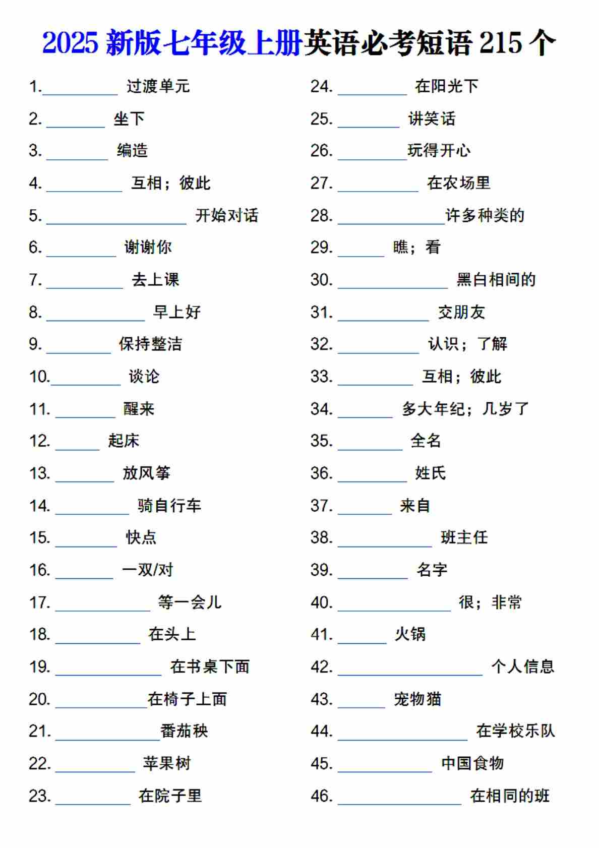 2025新版七上英语必考短语215个