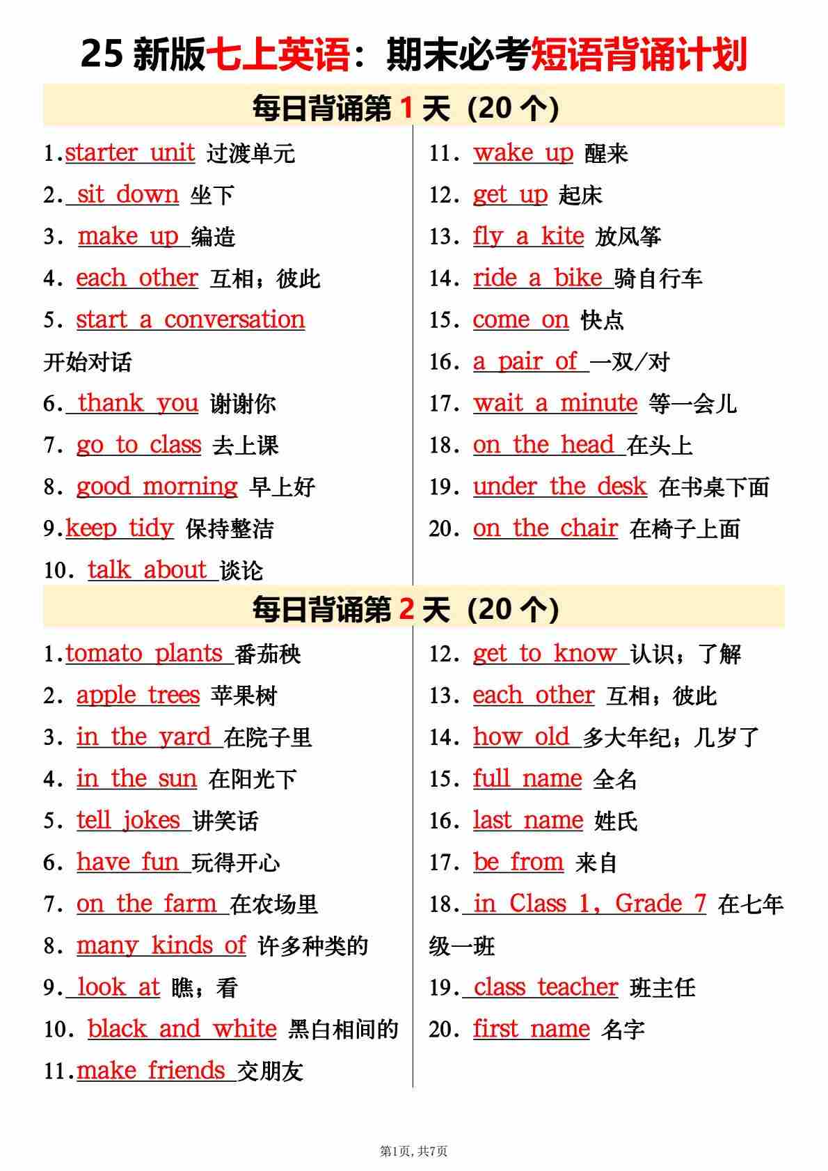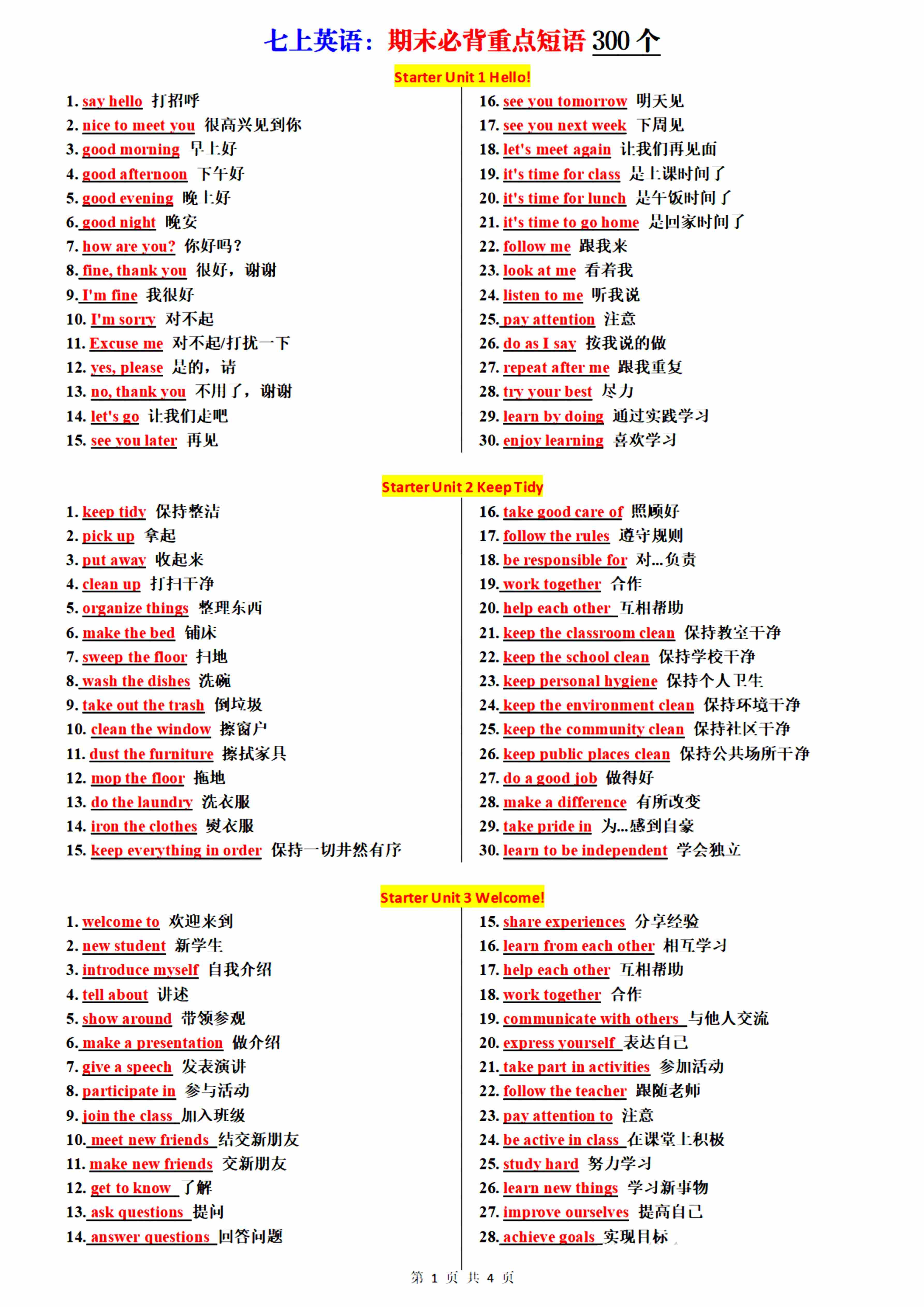 七上英语期末必背重点短语300个