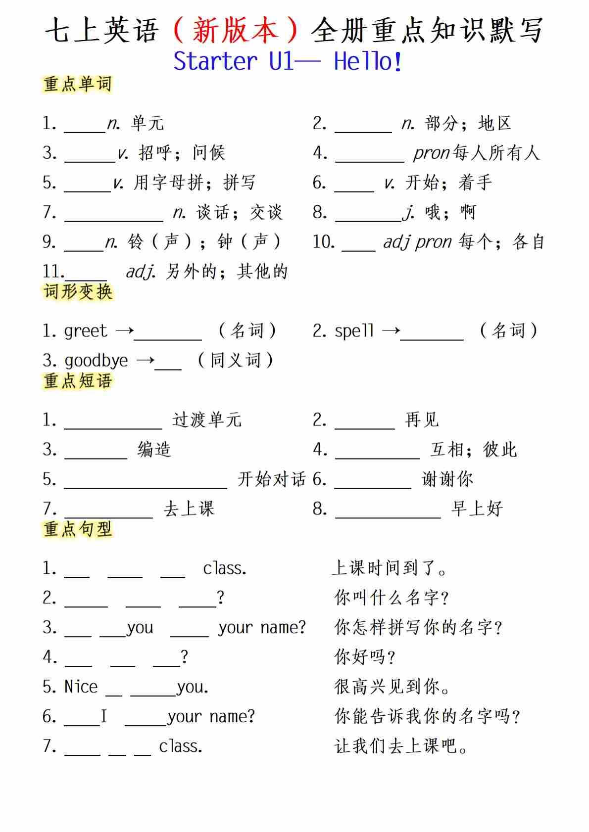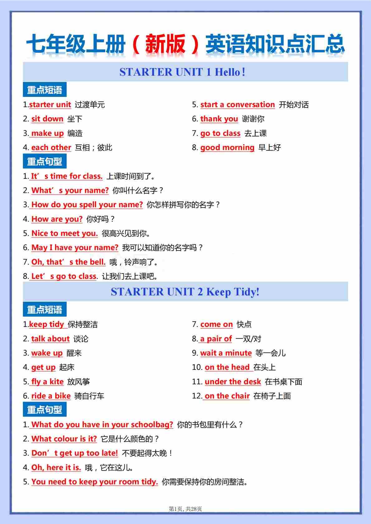 【2默写】七上英语人教版全册重点知识总结