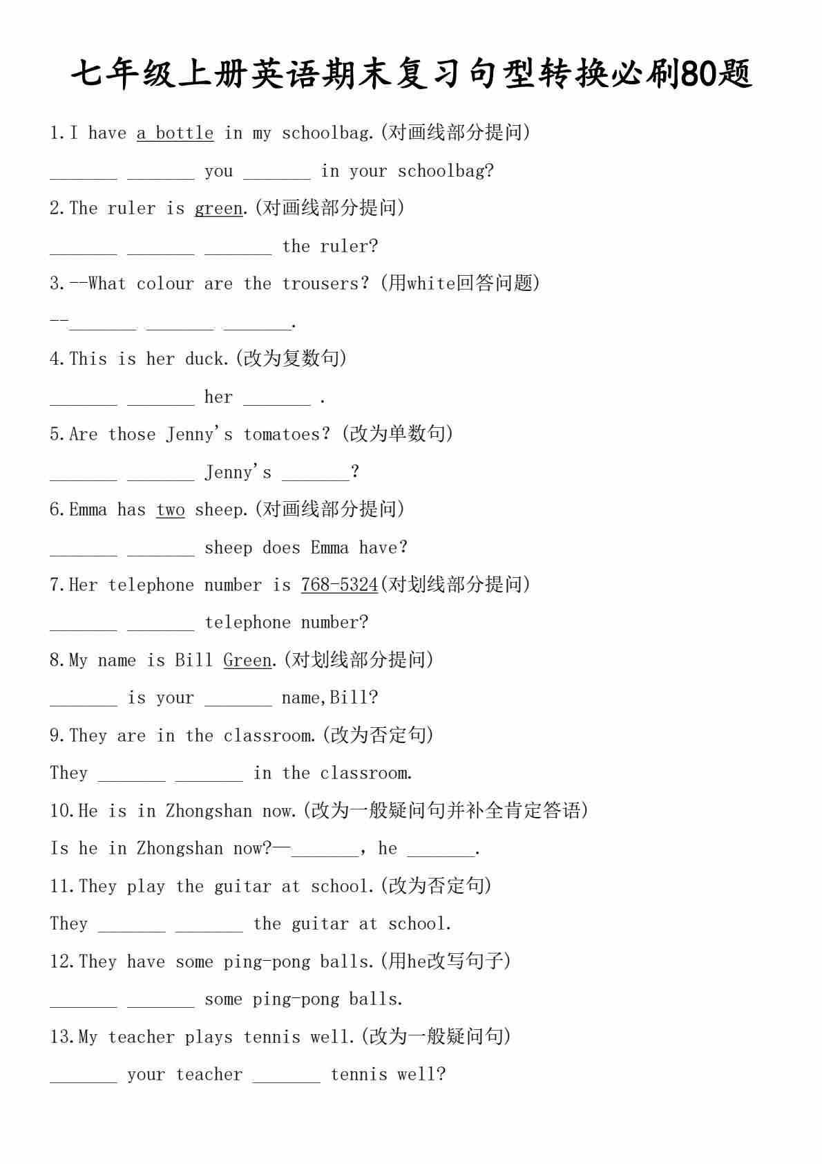 七年级上册英语期末复习句型转换必刷80题