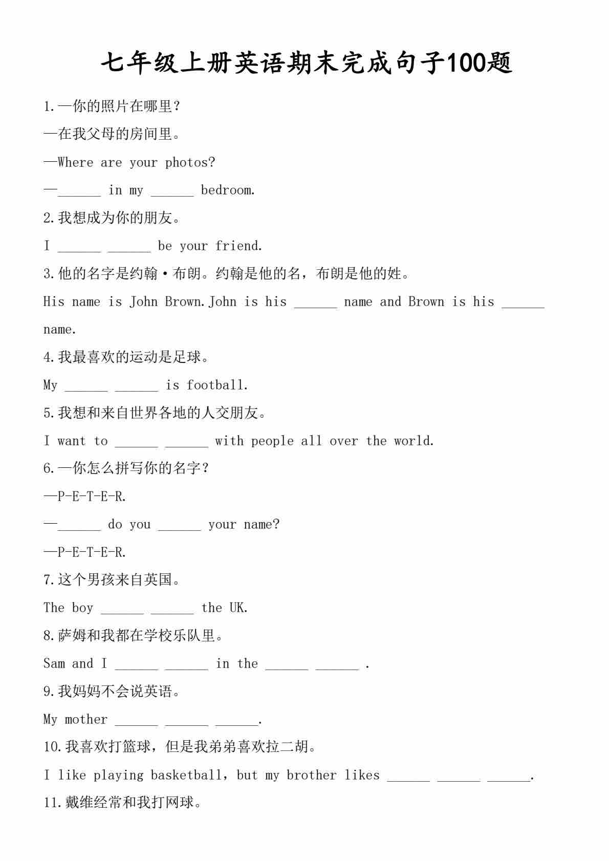 七年级上册英语期末完成句子100题