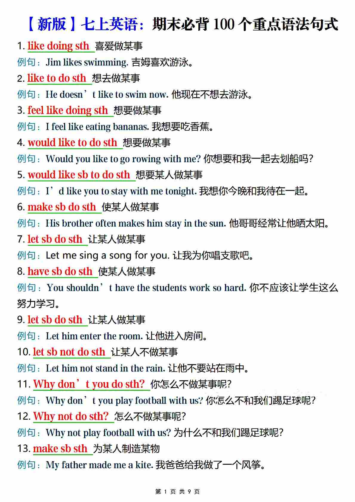 【11.29】七上英语期末必背100个重点语法句式