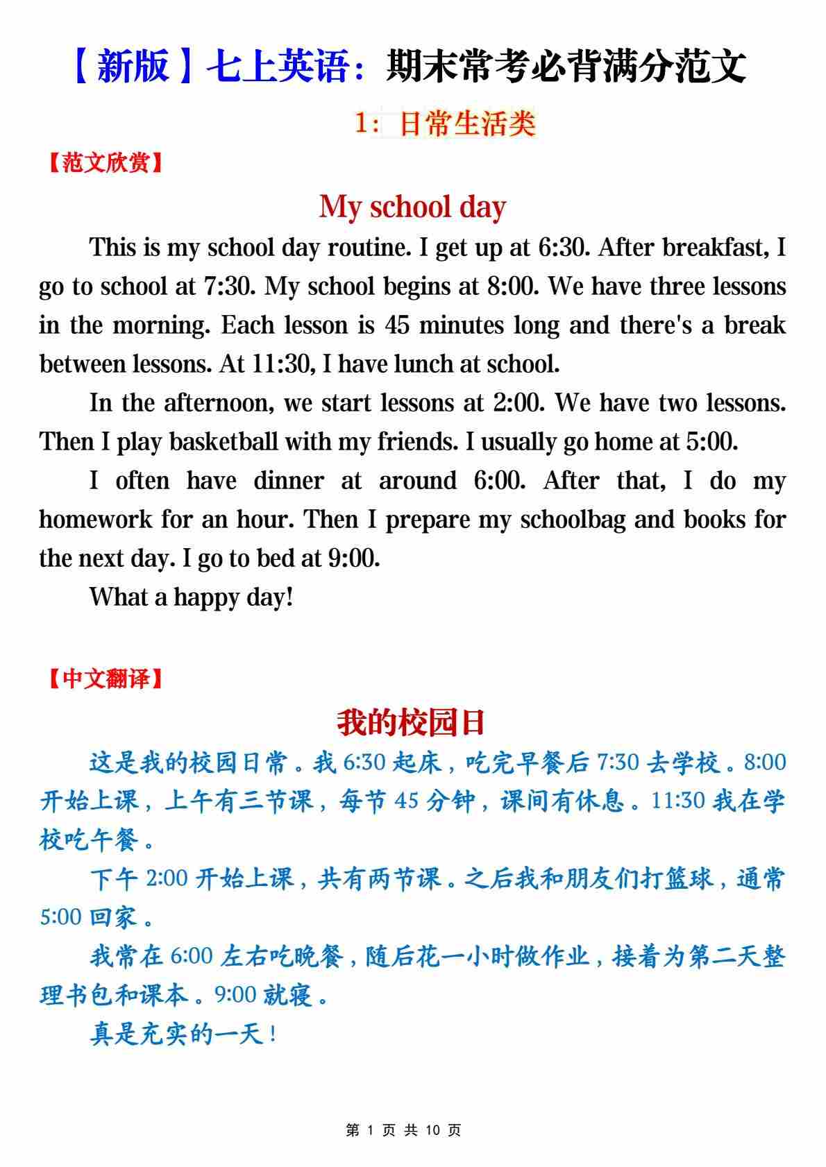 【12.2】七上英语期末常考必背满分作文