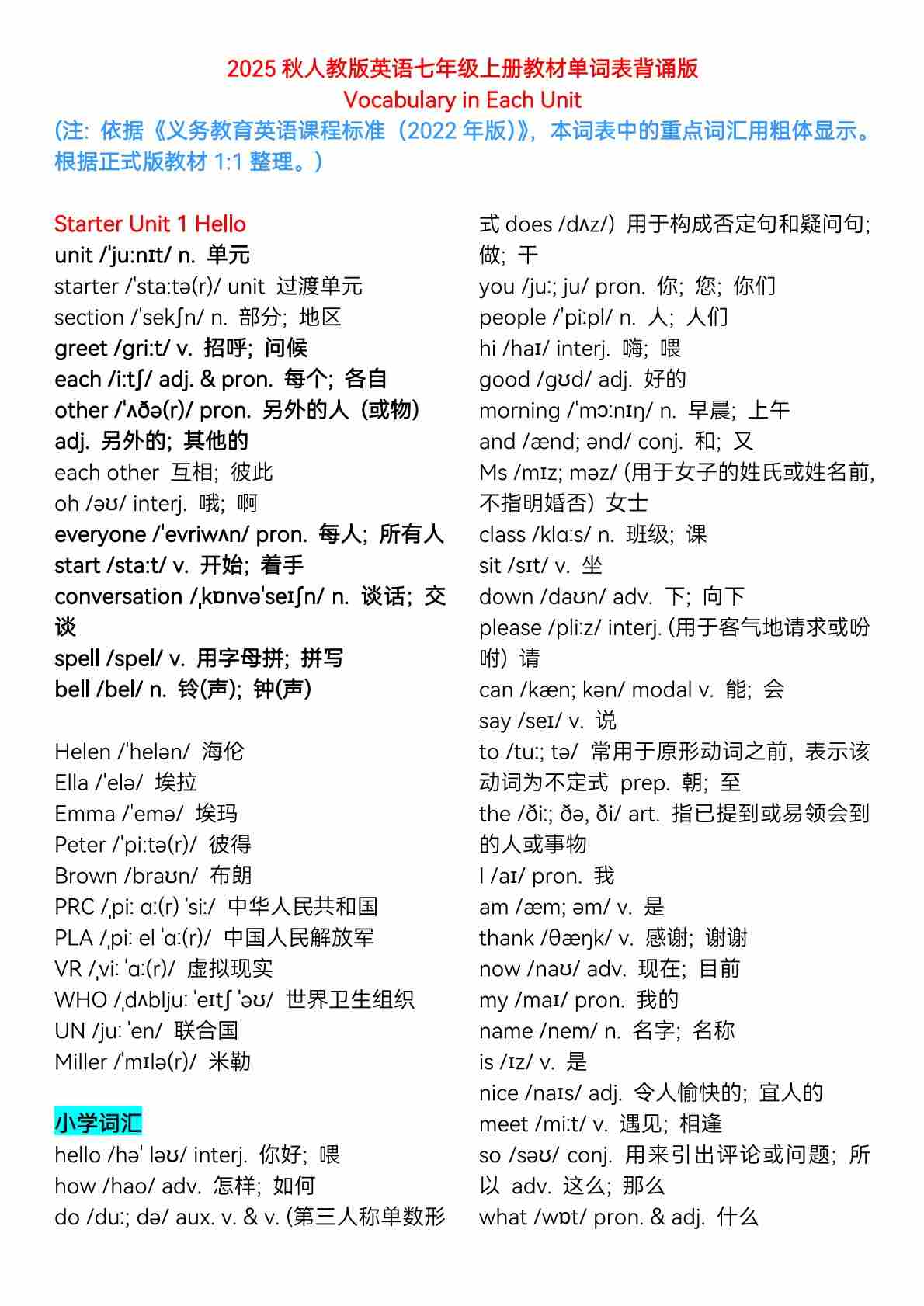 2025秋人教版七上英语单词表背诵版
