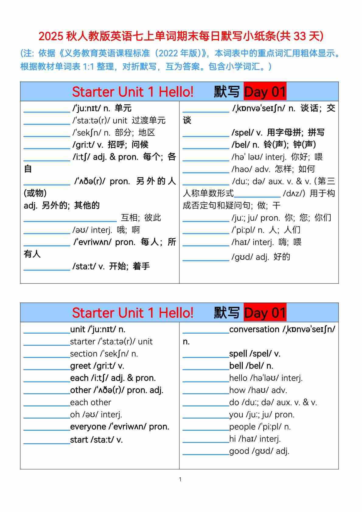 2025秋人教版英语七上全册单词(含小学词汇)期末每日默写小纸条(共33天) 中英互默(1)
