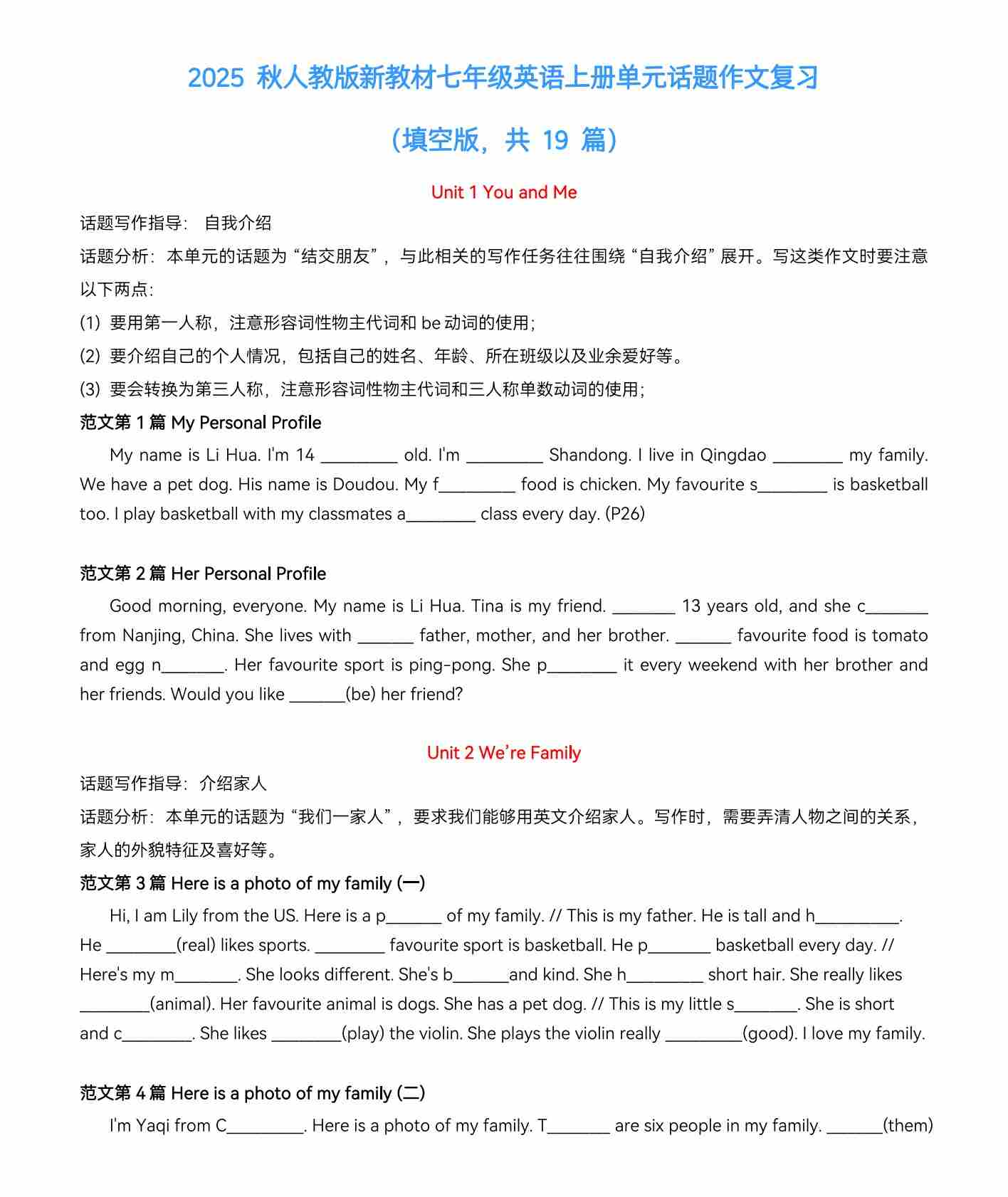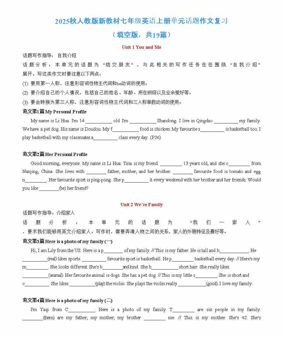 期末单元话题作文复习挖空版(含答案)人教版(2024)七年级英语上册word