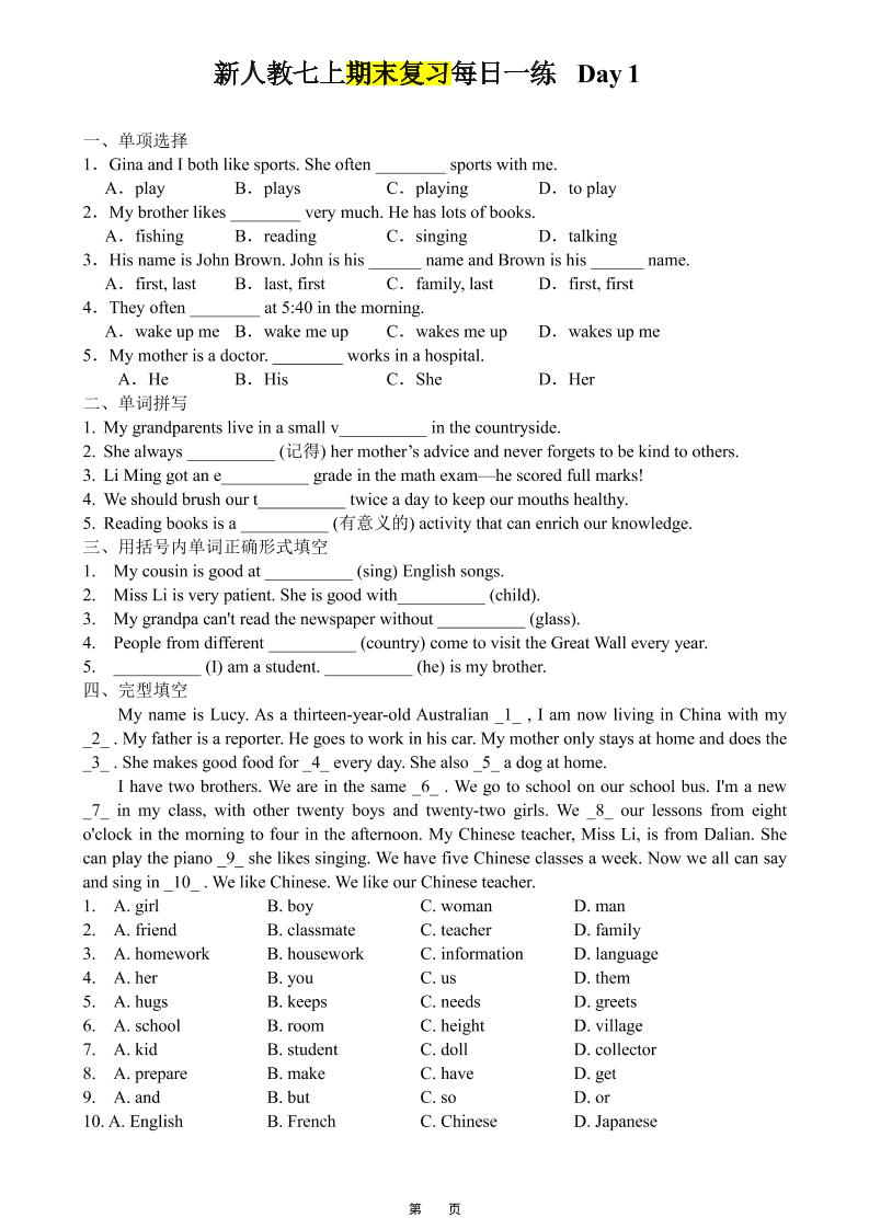 新人教七上英语期末复习每日一练答案