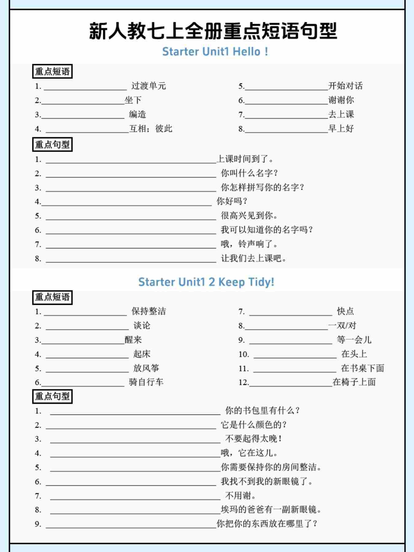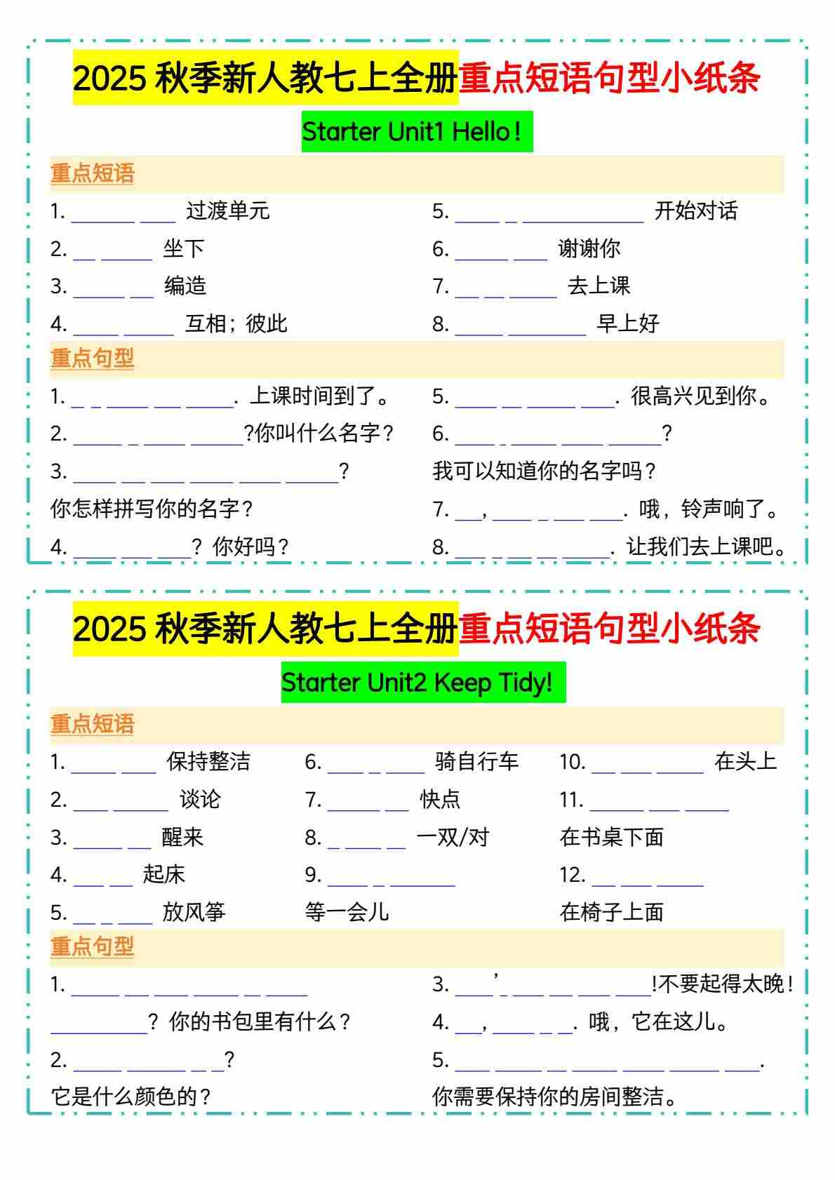 2025秋季新人教七上全册重点短语句型小纸条【空白版】