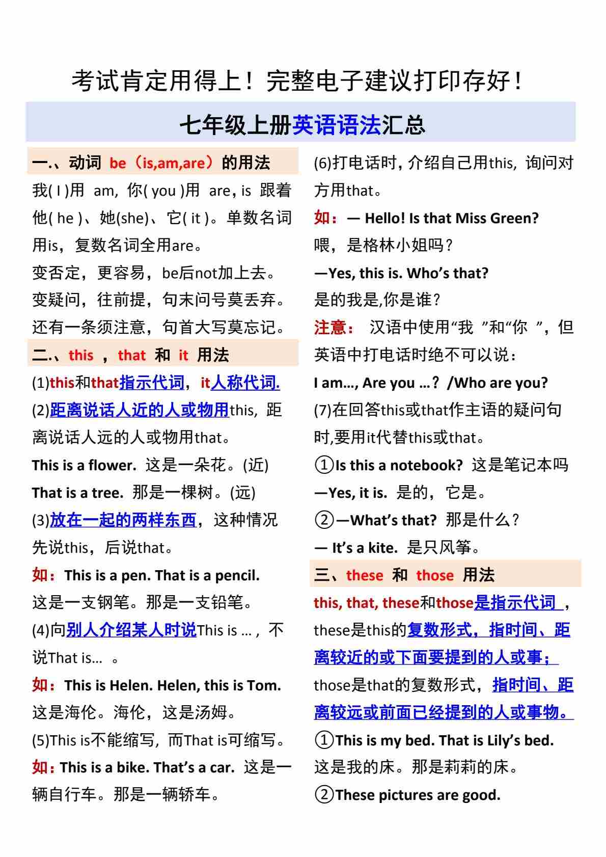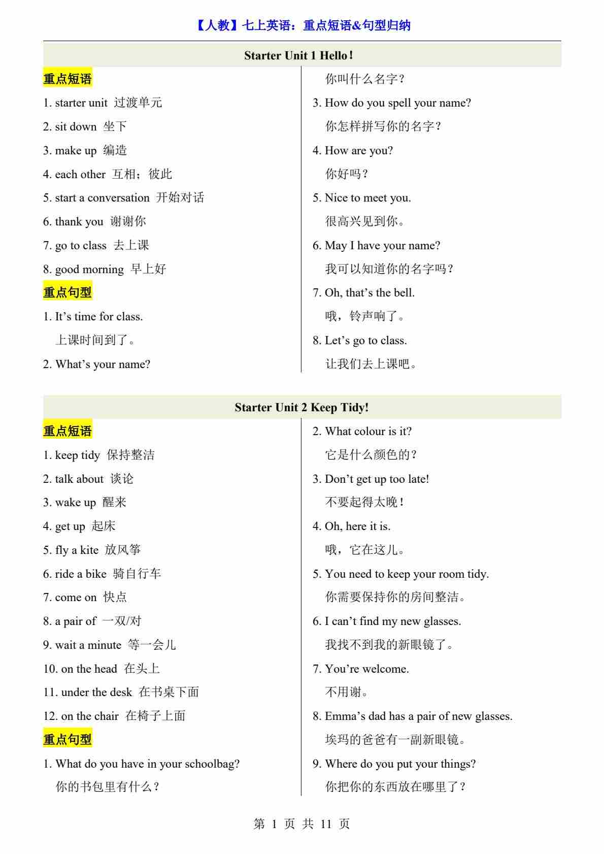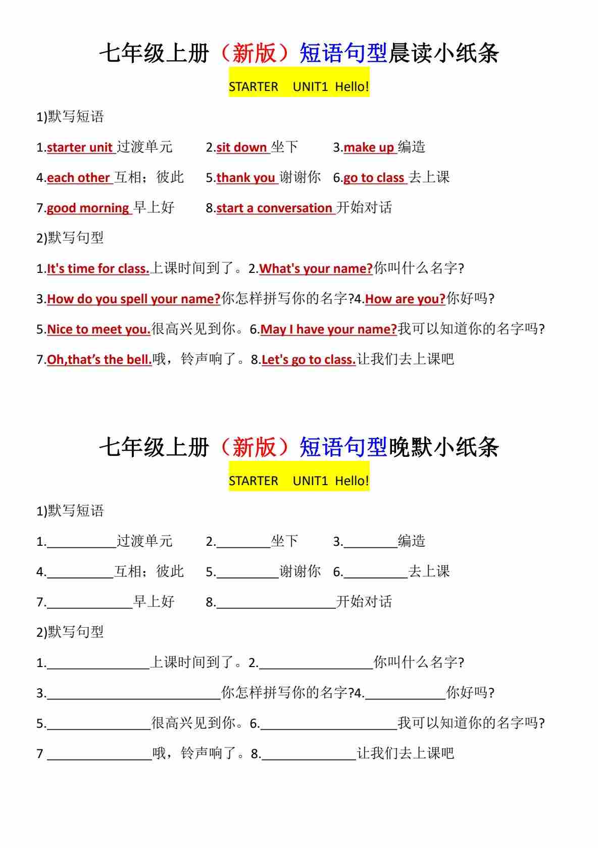 2025秋季新人教七上全册重点短语句型小纸条【答案版】