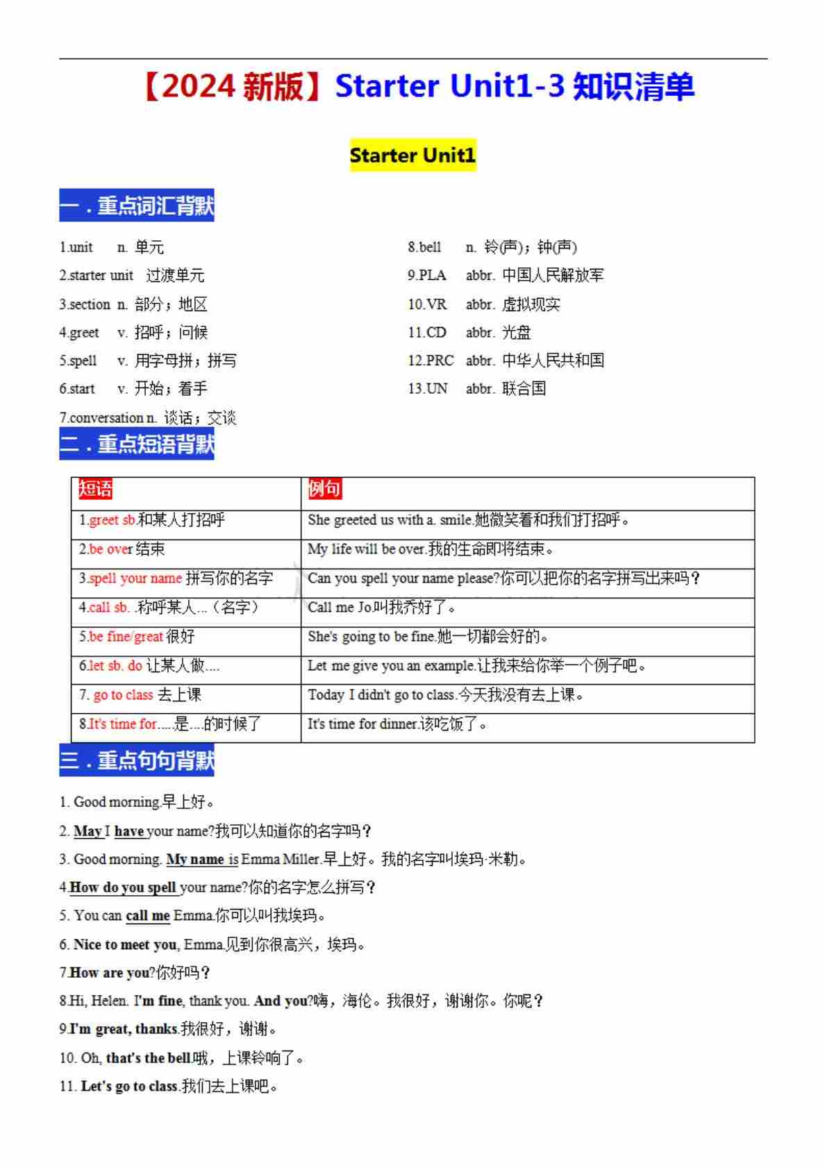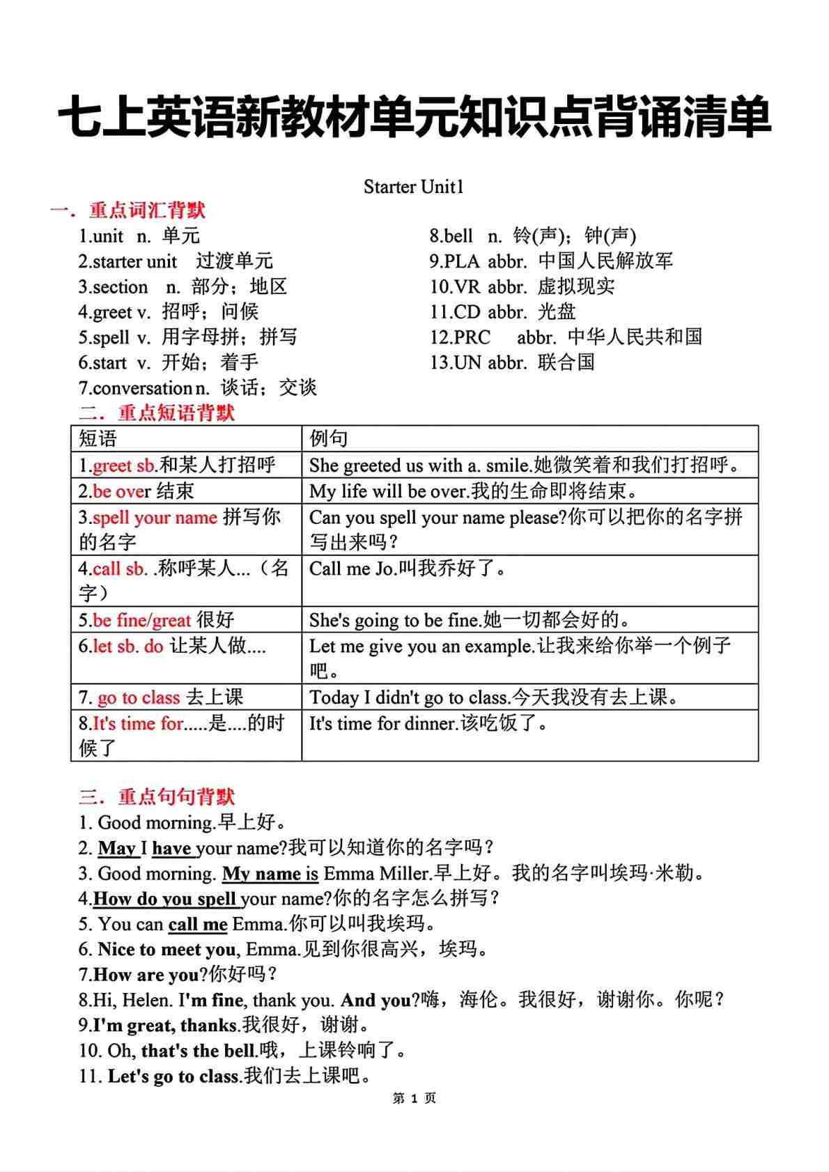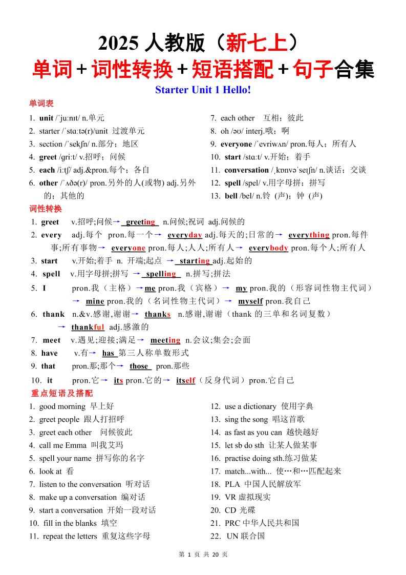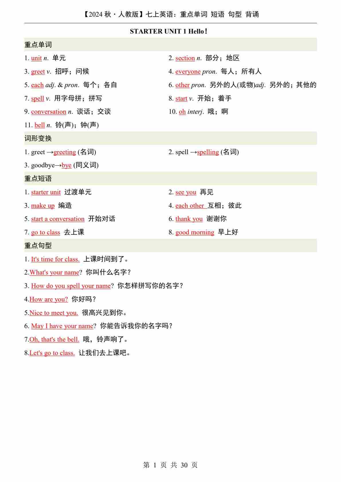 人教版新七上单词表词性转换短语搭配句子 (背诵版)