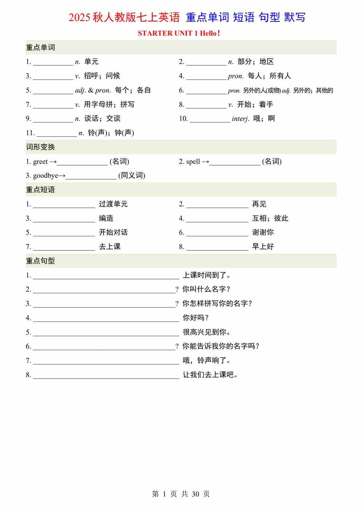 人教版新七上单词表词性转换短语搭配句子(默写英文)