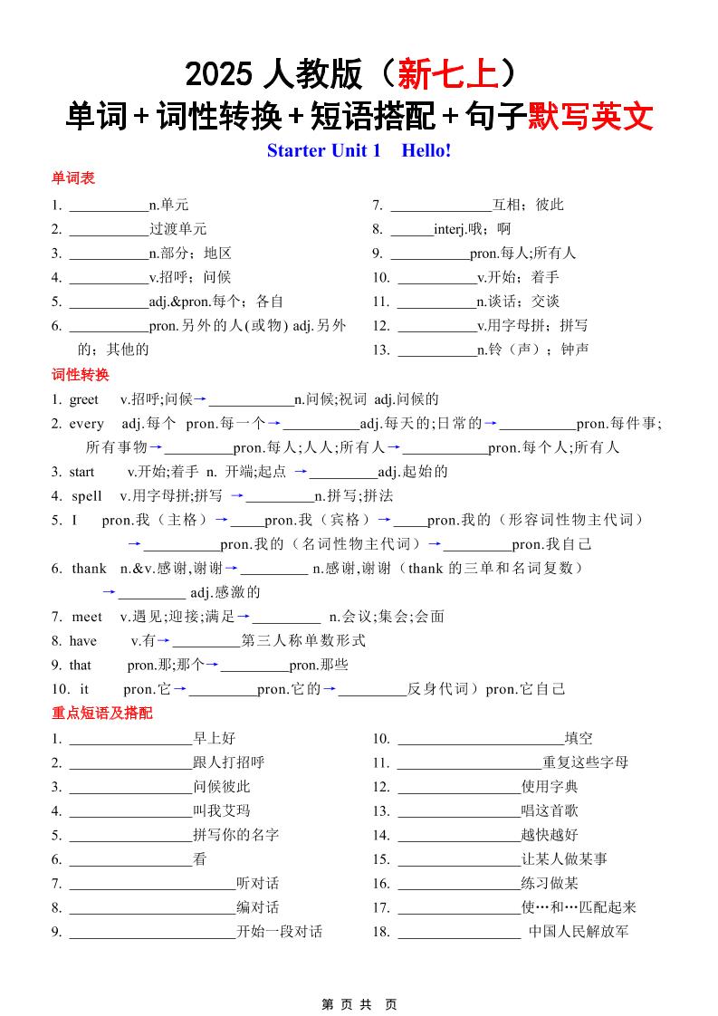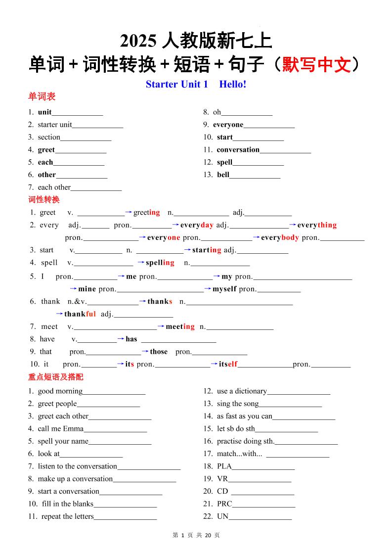 人教版新七上单词表词性转换短语搭配句子 (默写中文)