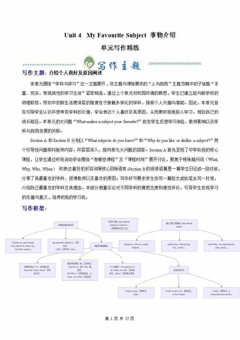 Unit 4 My Favourite Subject 介绍个人喜好及原因阐述(单元写作精练)(解析版)