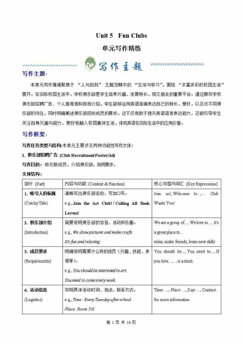 Unit 5 Fun Clubs (单元写作精练)(原卷版)