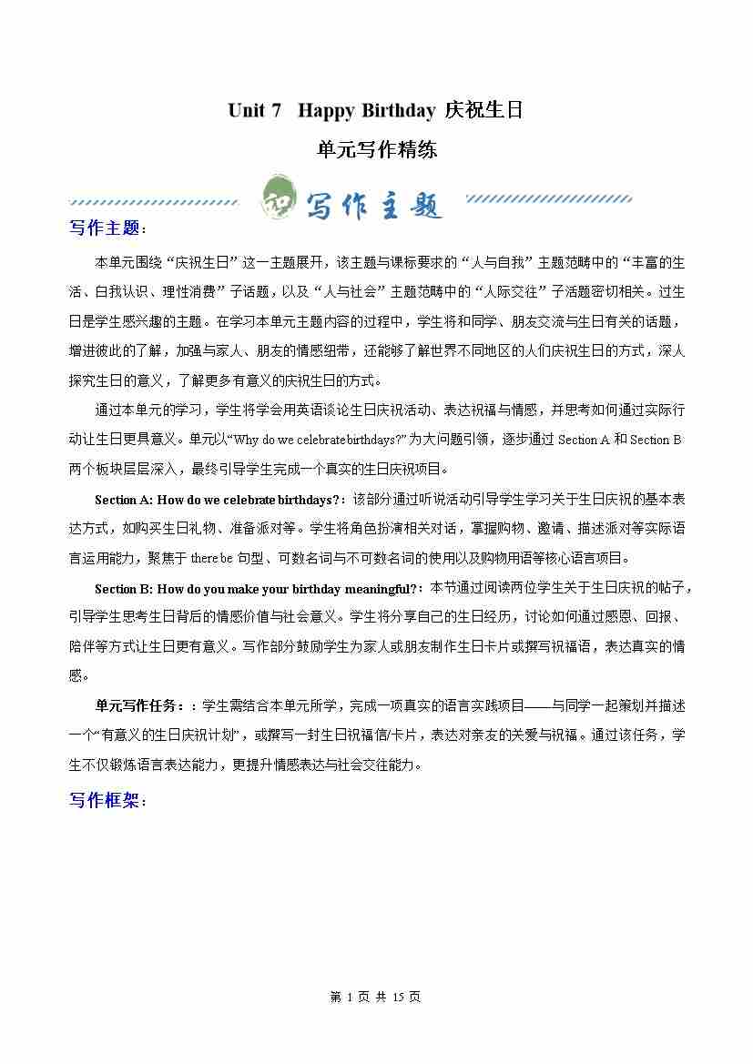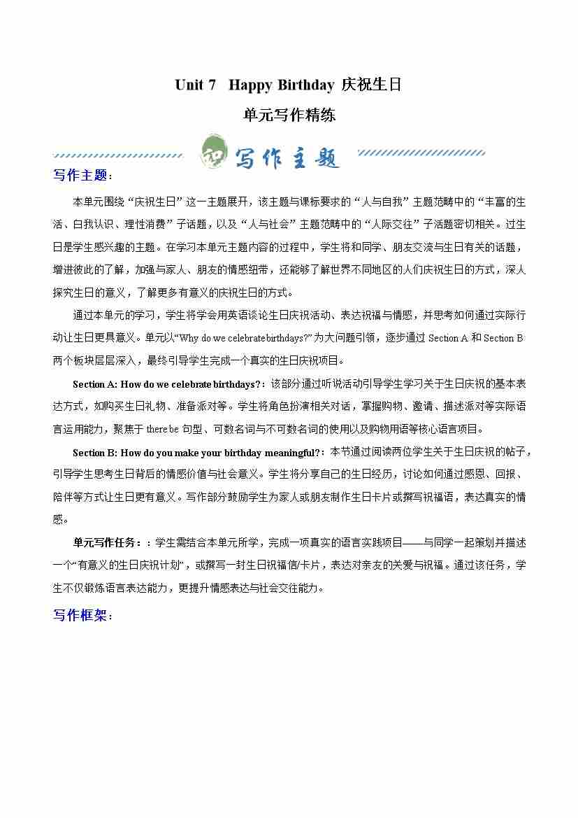 Unit 7 Happy Birthday 庆祝生日(单元写作精练)(解析版)