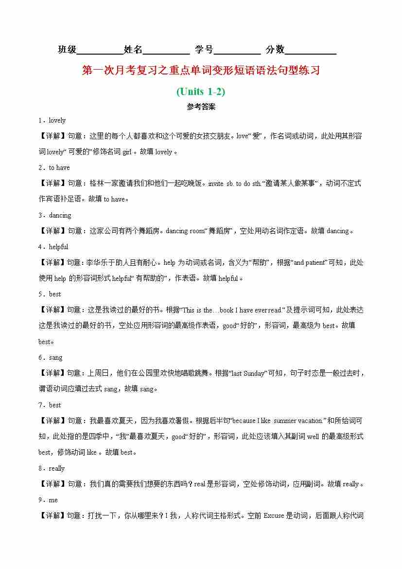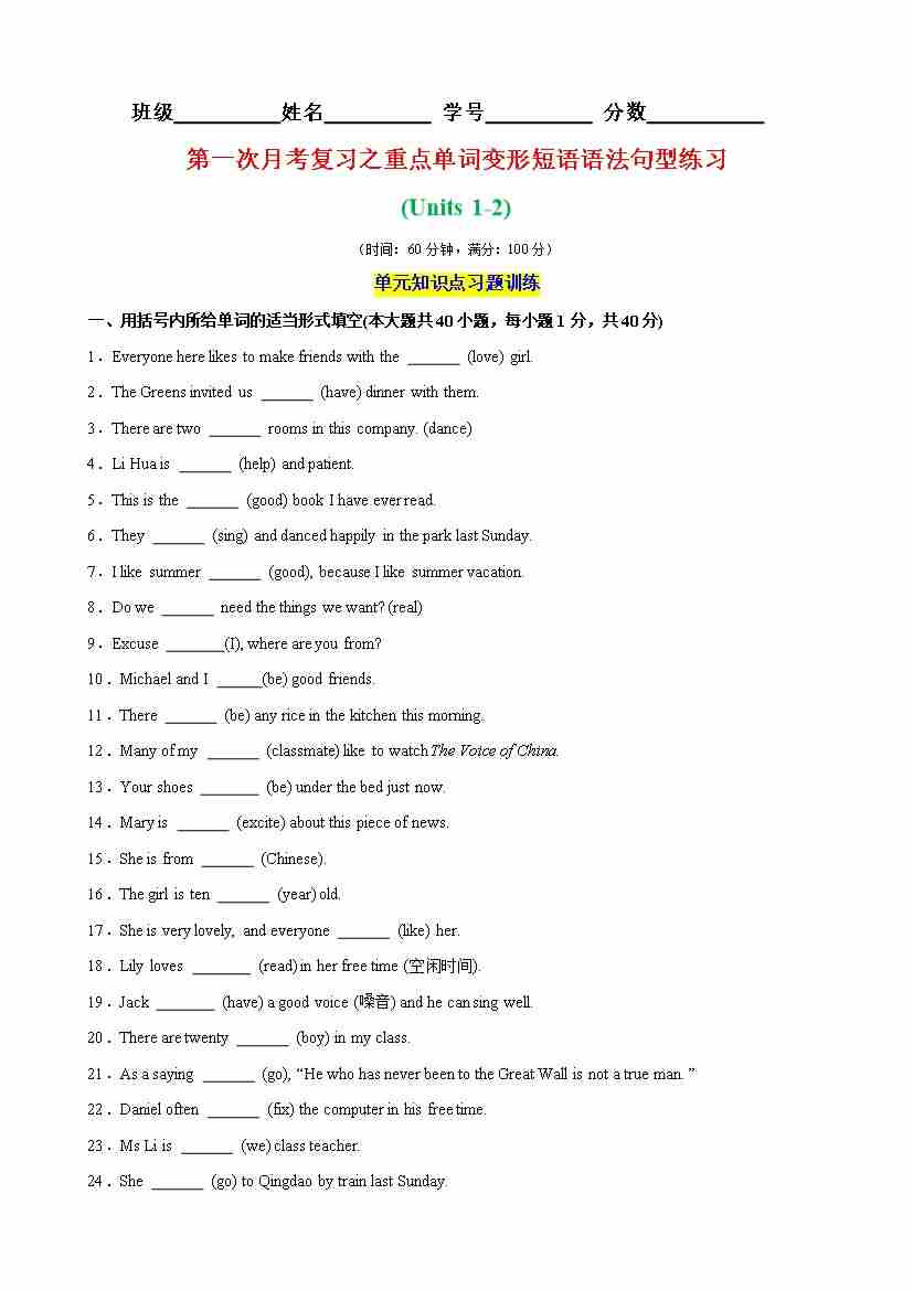 第一次月考复习之重点单词变形短语语法句型练习(Units 12)(教师版)