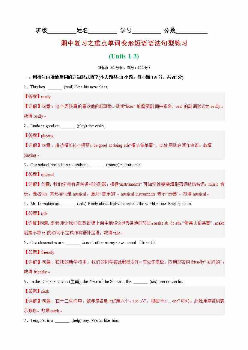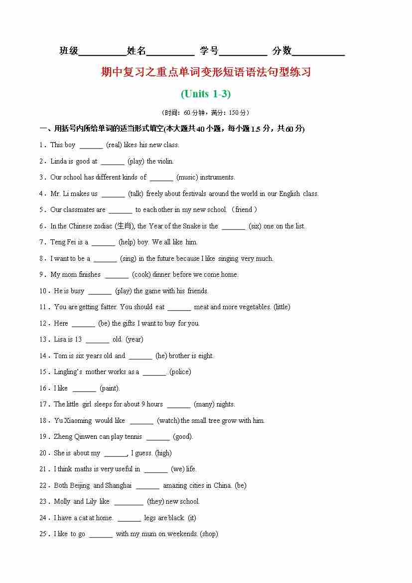 期中复习之重点单词,词性转换,短语,语法,句型练习100题(学生版)