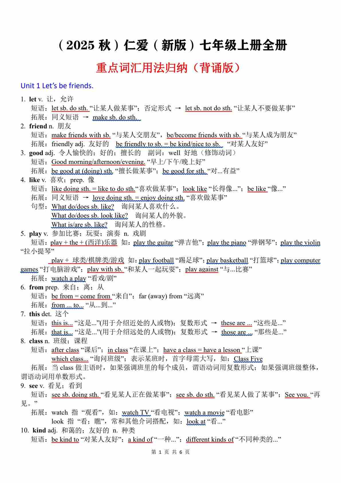 2025秋七上重点词汇用法归纳(默写版)