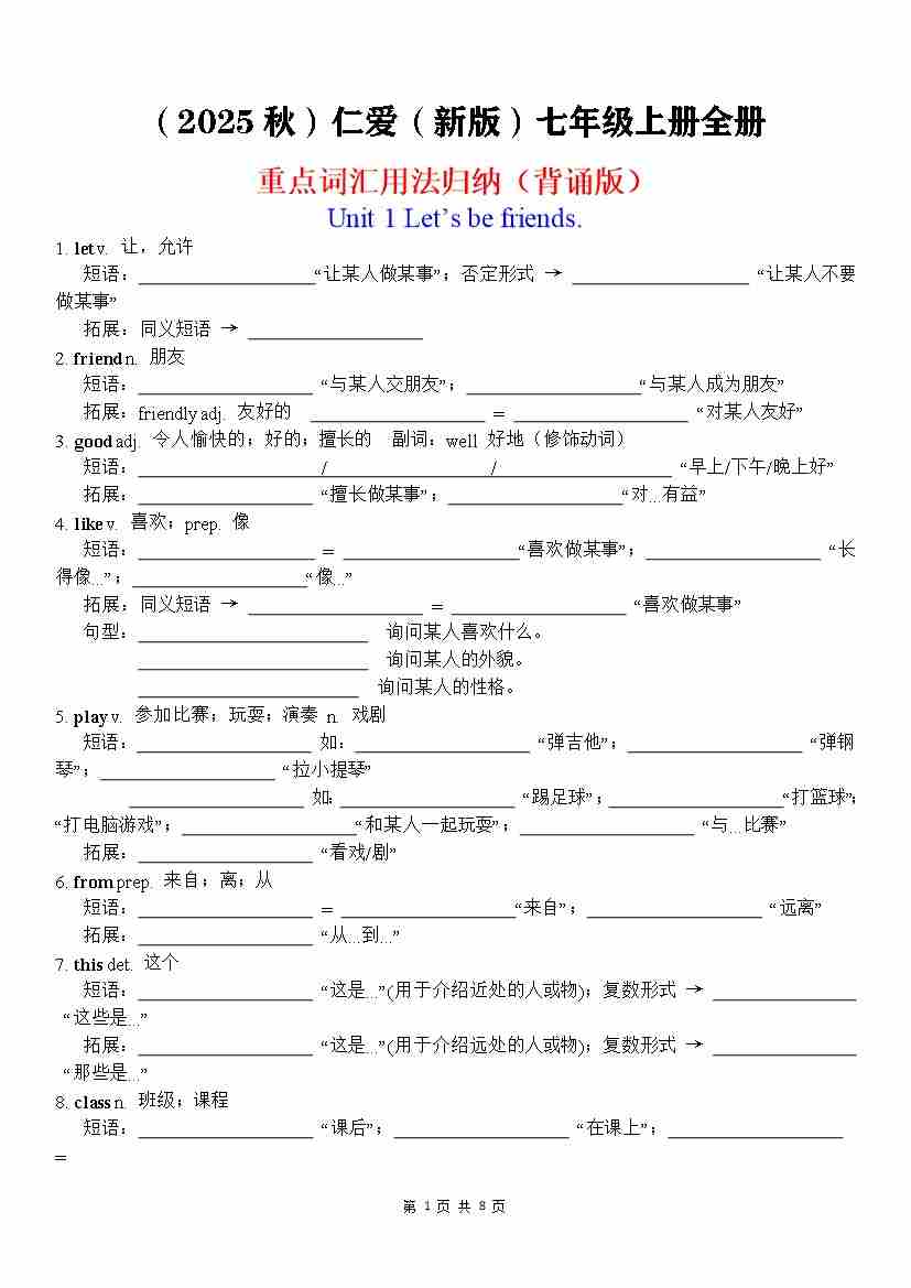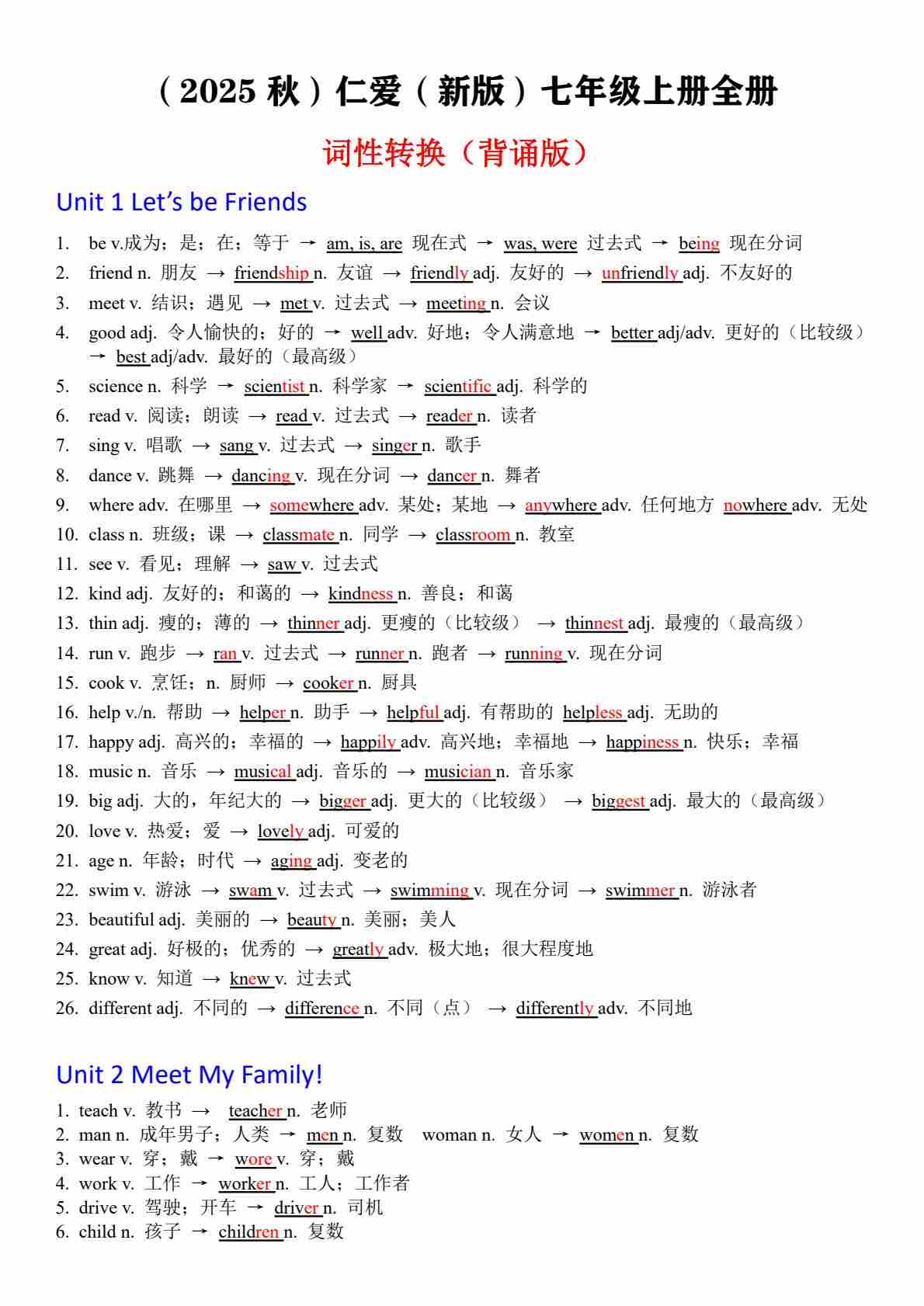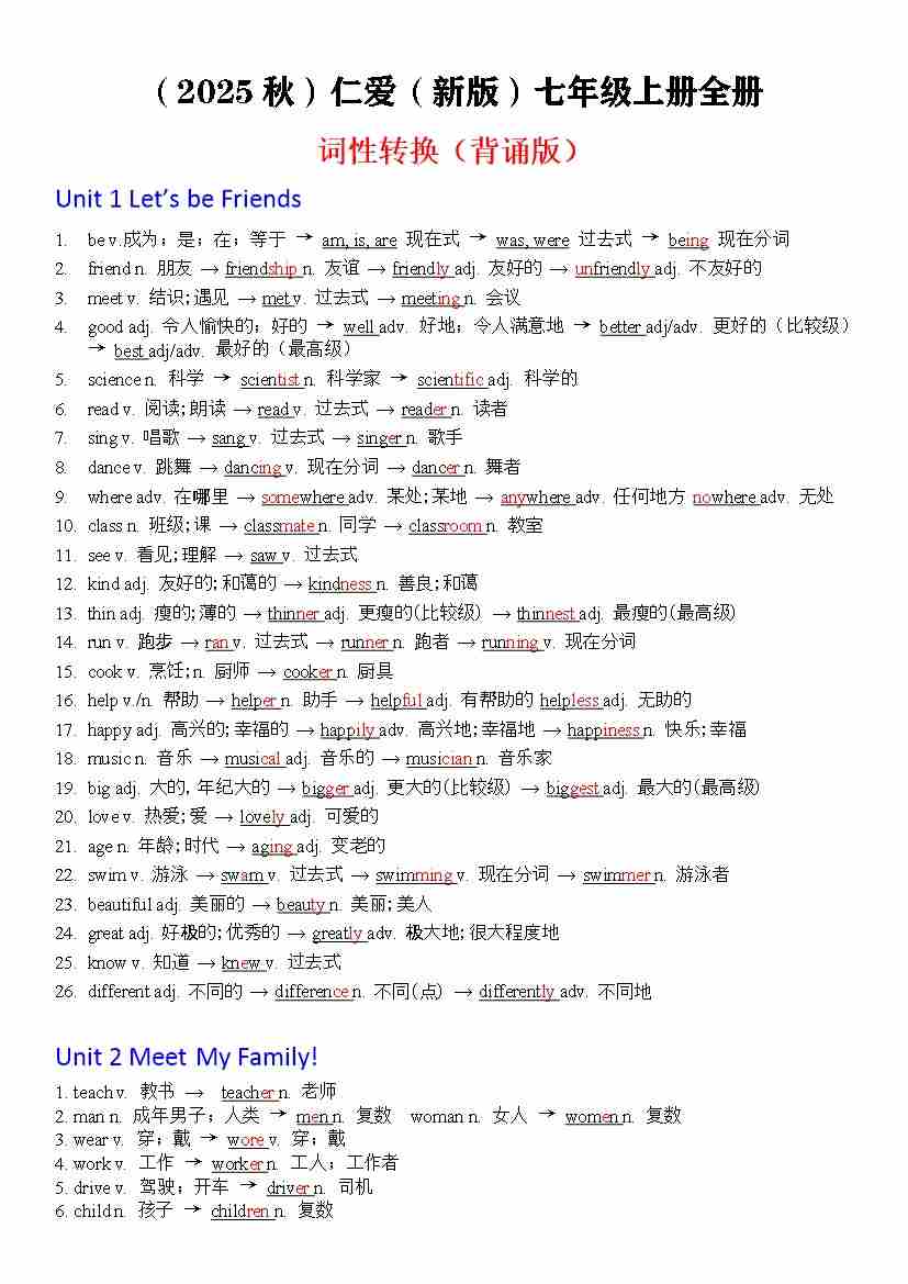 2025秋七上词汇变形-----(背诵版)
