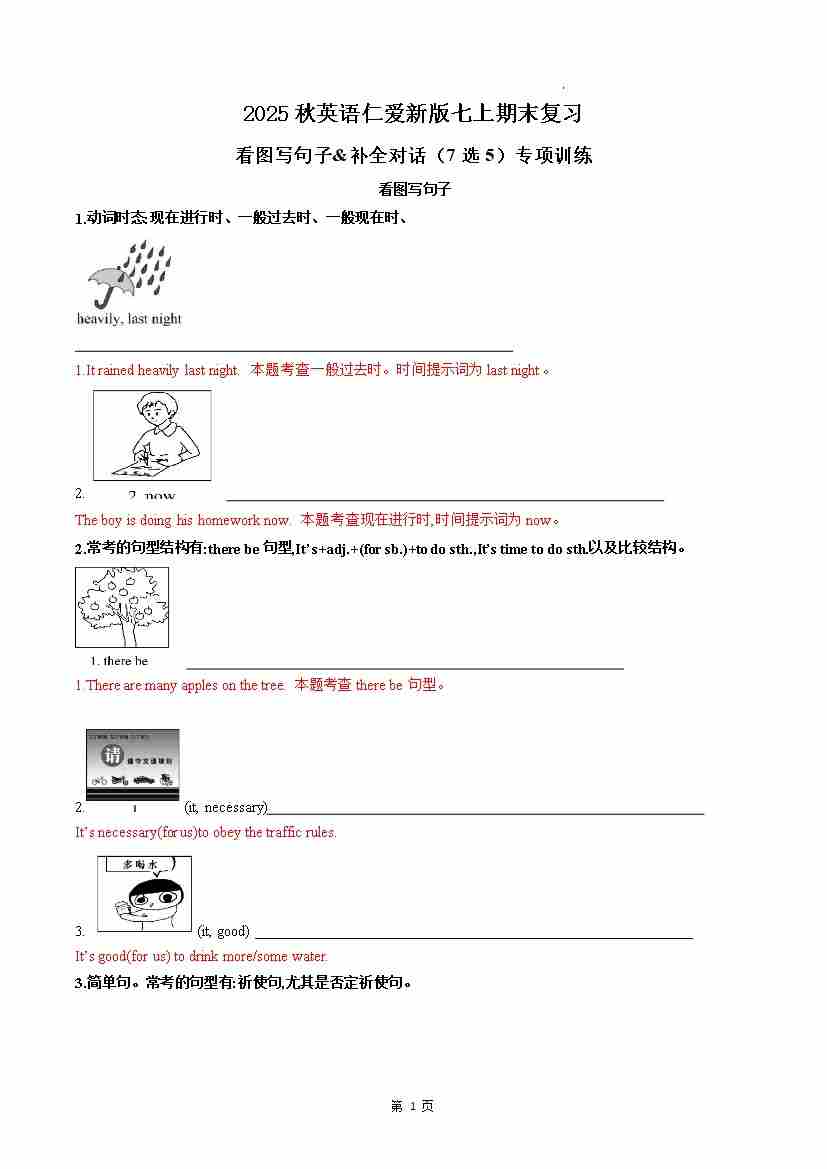 新仁爱七上看图写句子&补全对话(7选5)专项训练)解析版