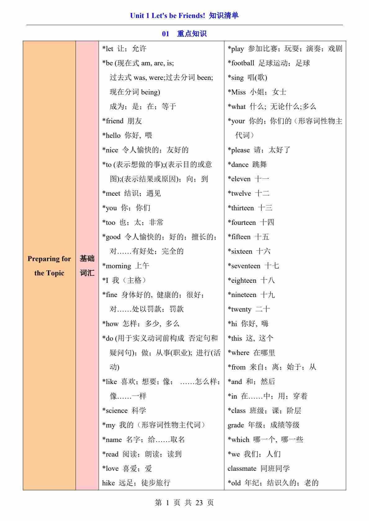 Unit 1 Let's be Friends!(知识清单)(答案版)