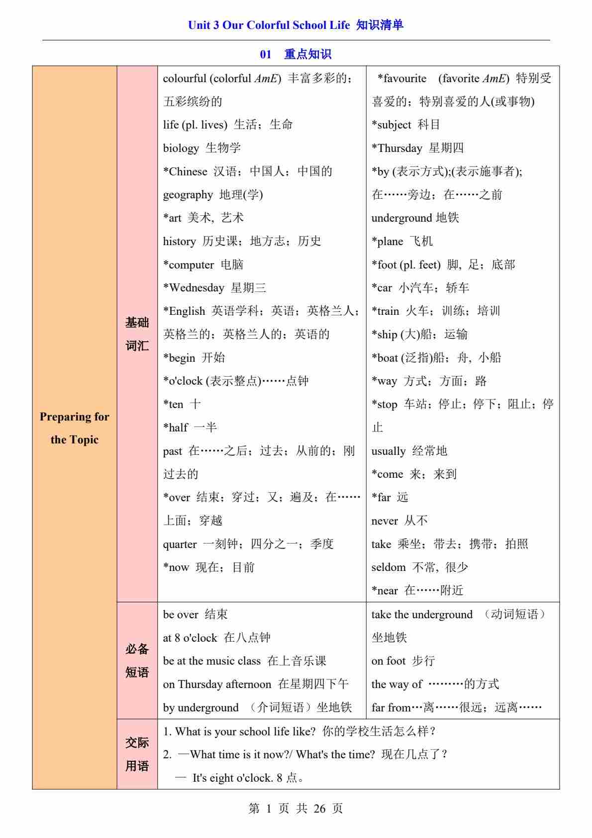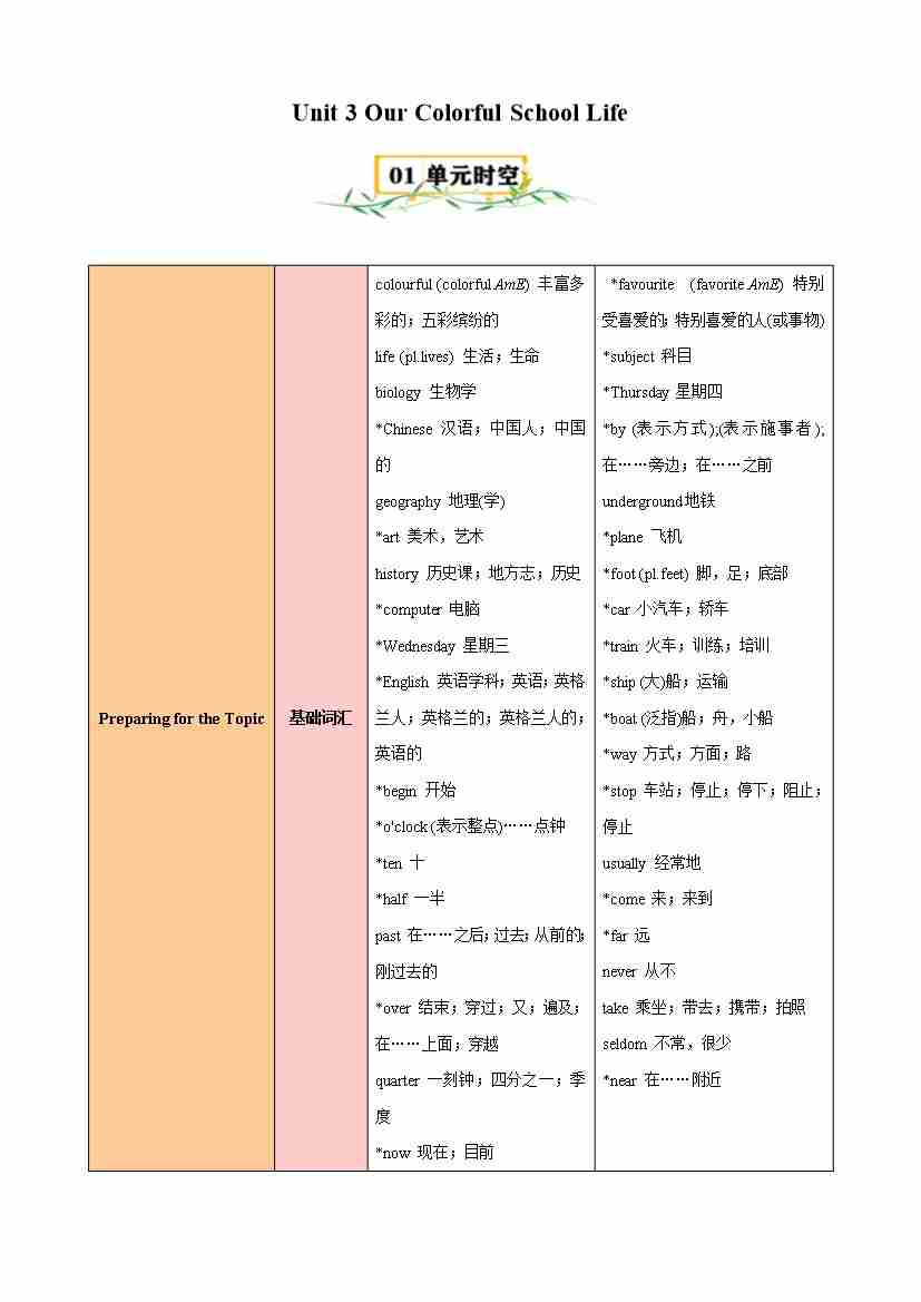 Unit 3 Our Colorful School Life(知识清单)(答案版)