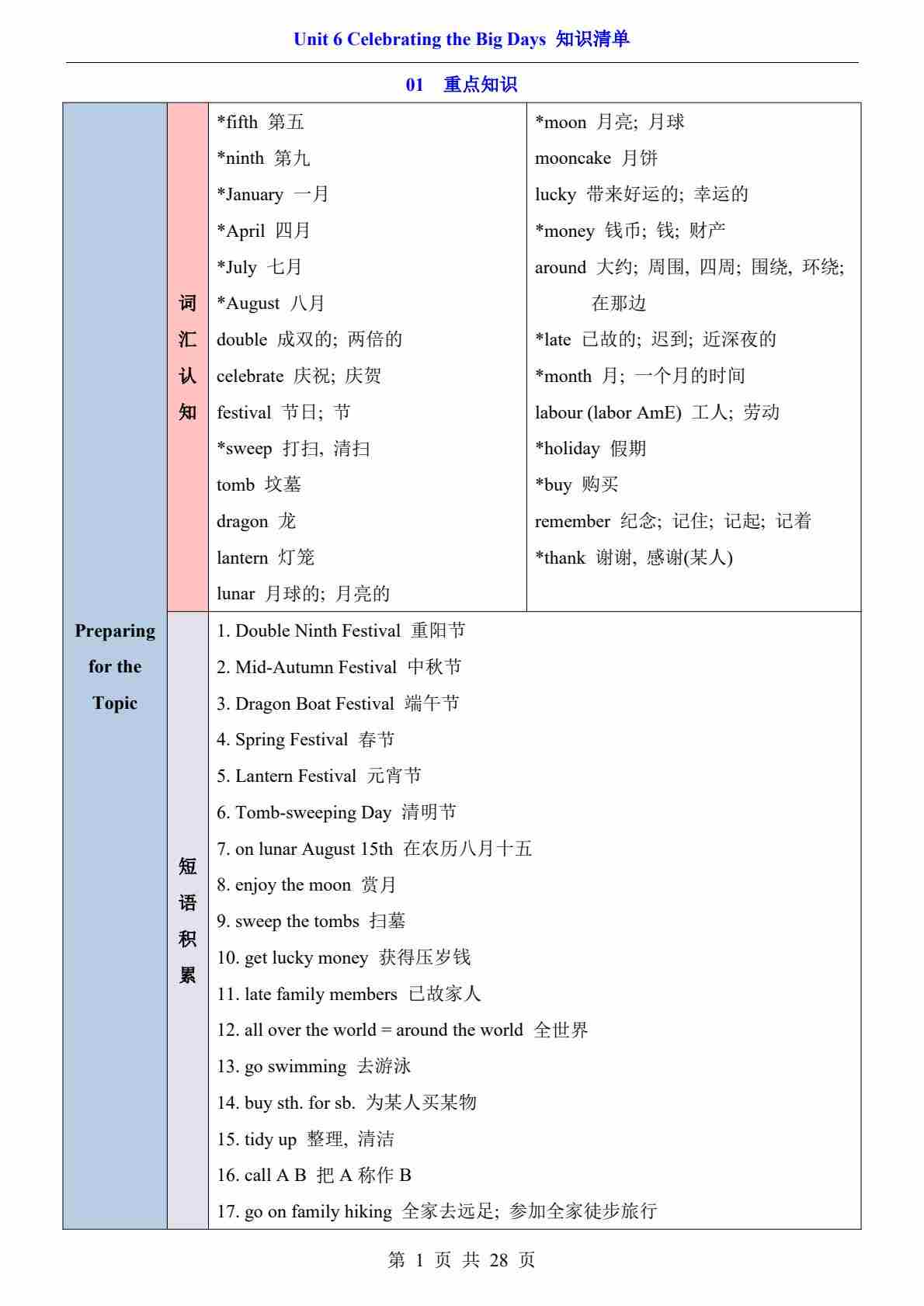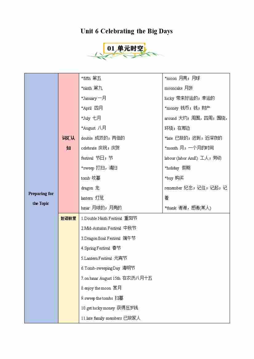 Unit 6 Celebrating the Big Days(知识清单)(答案版)