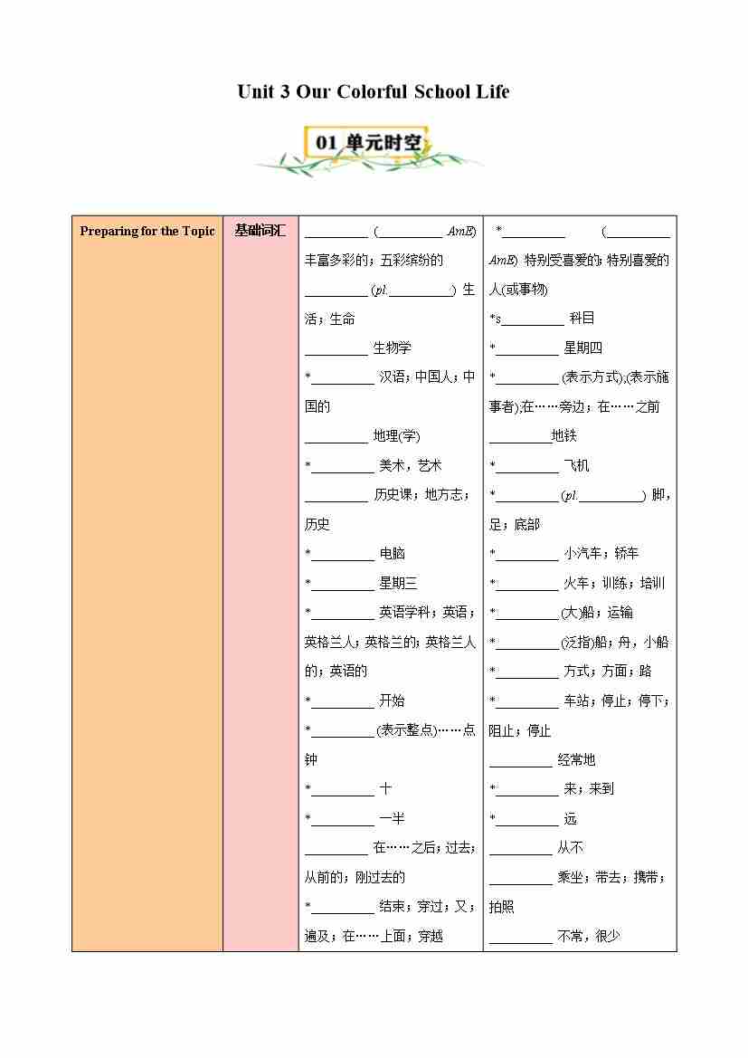 Unit 3 Our Colorful School Life(知识清单)(挖空版)