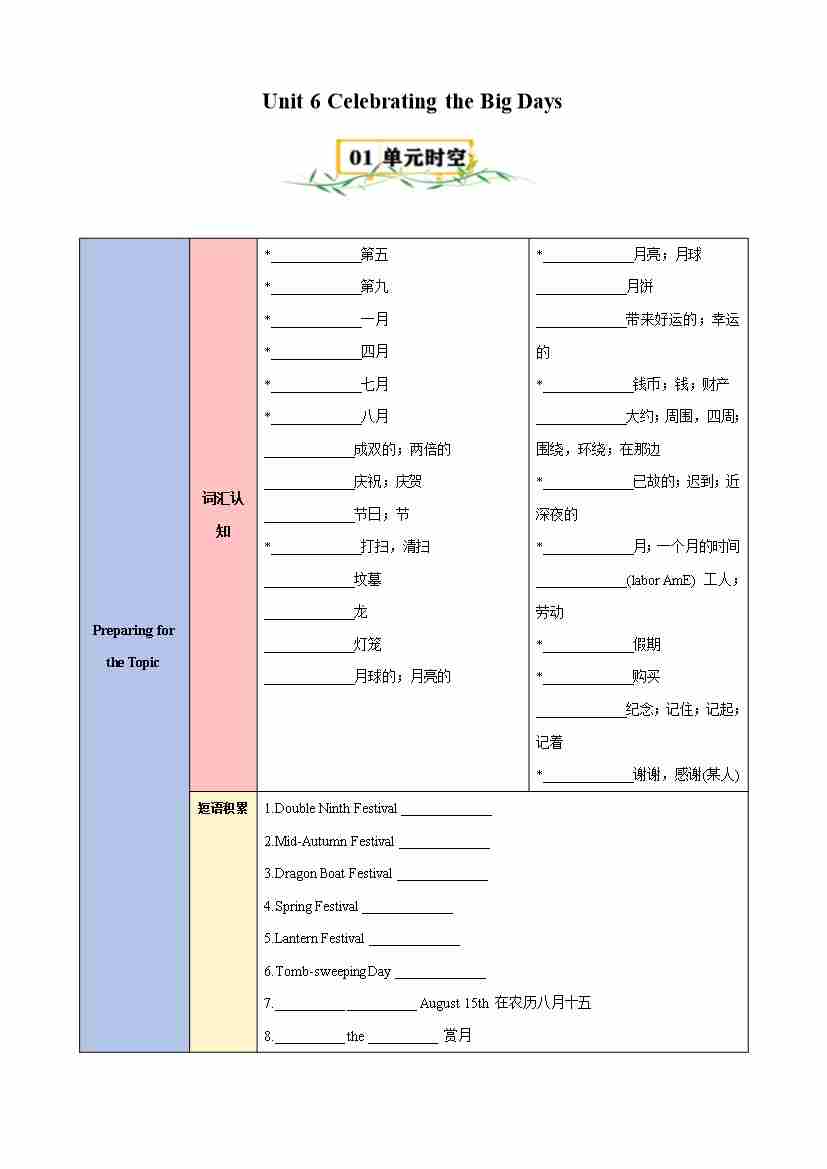 Unit 6 Celebrating the Big Days(知识清单)(挖空版)