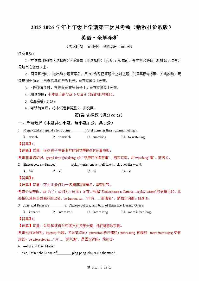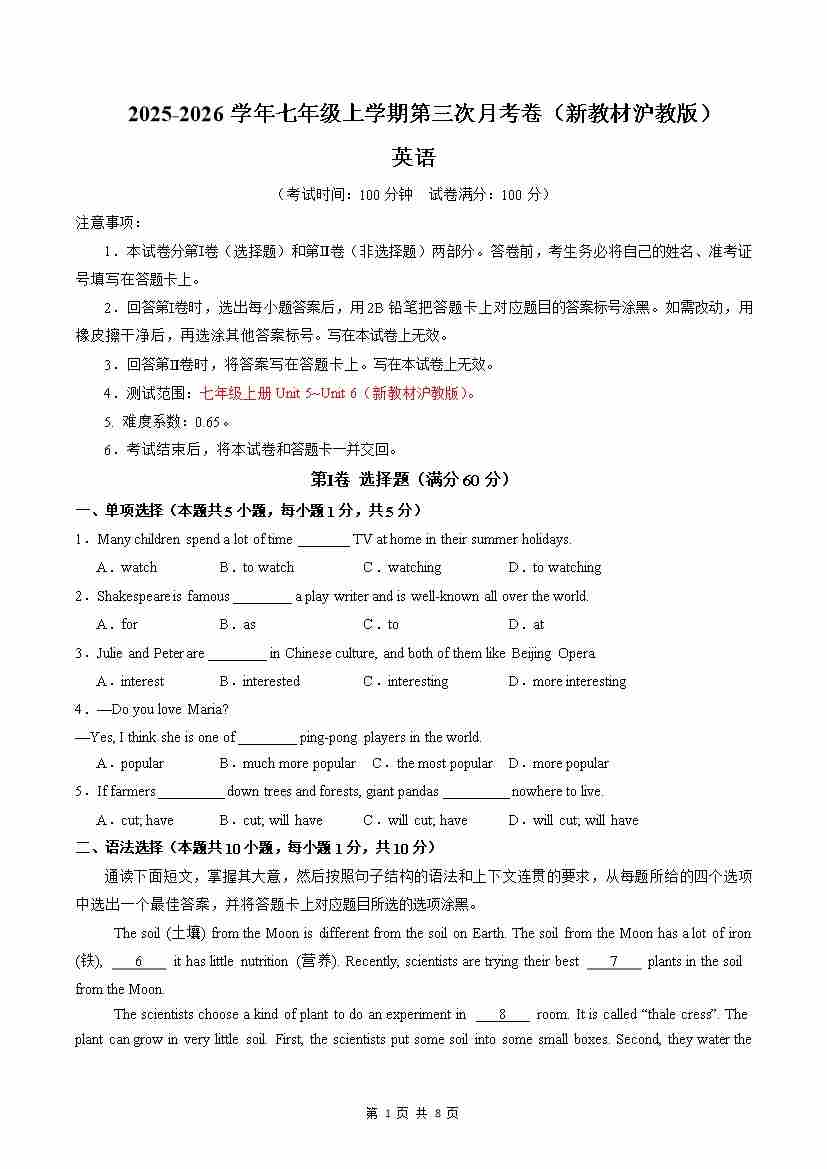 【沪教】7上英语第3次月考【U5-6】25秋
