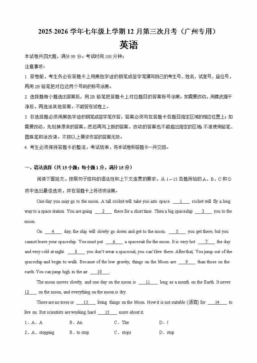 七年级英语上学期12月第三次月考(广州卷)(原卷版)