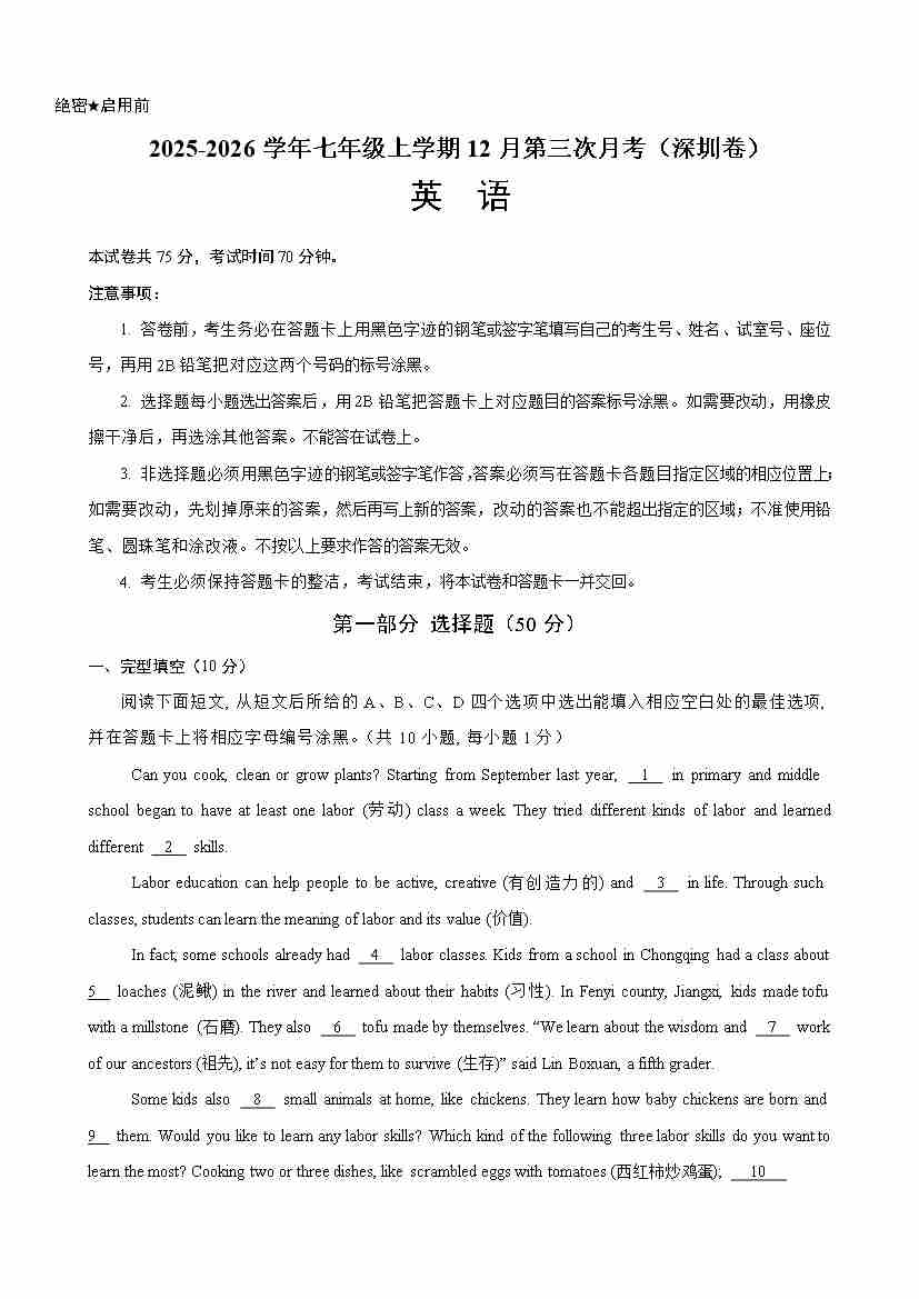 七年级英语上学期12月第三次月考(深圳卷)(原卷版)