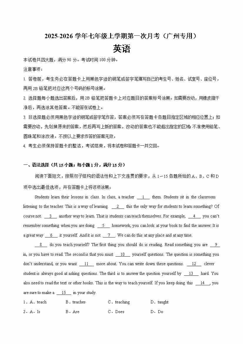 七年级英语上学期第一次月考(广州专用)(学生版)