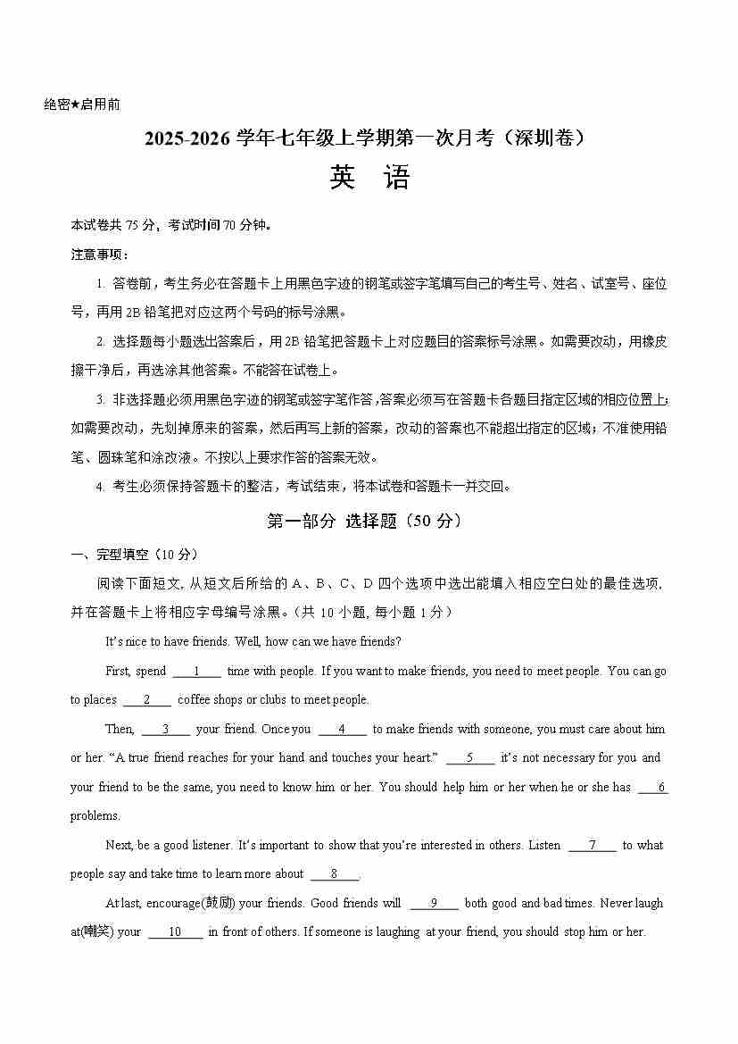 七年级英语上学期第一次月考(深圳卷)