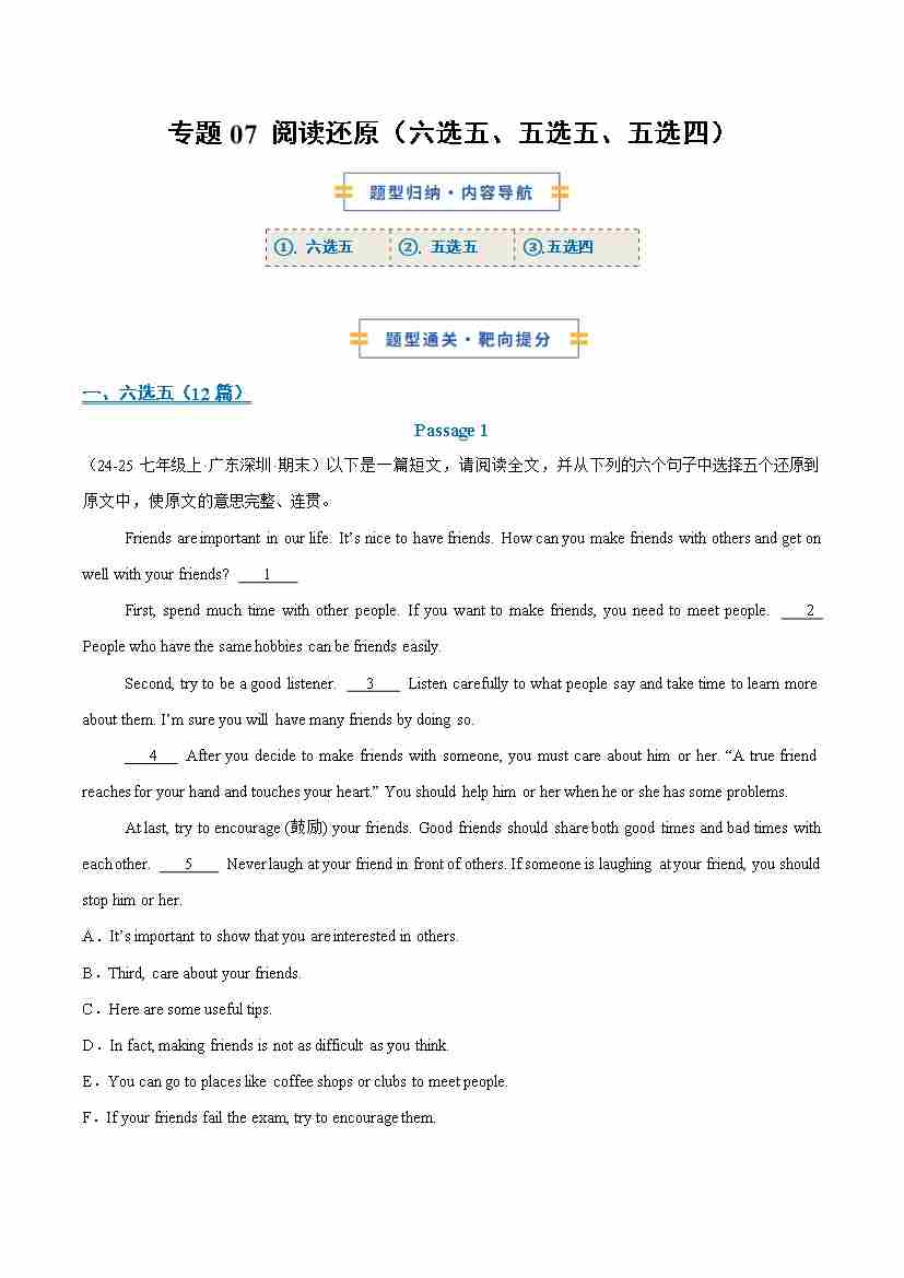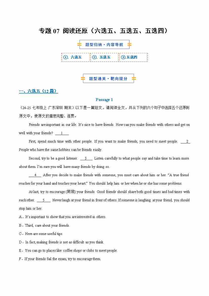考前押题07 阅读还原(六选五、五选五、五选四)(期末复习专项训练)(解析版)七上沪教