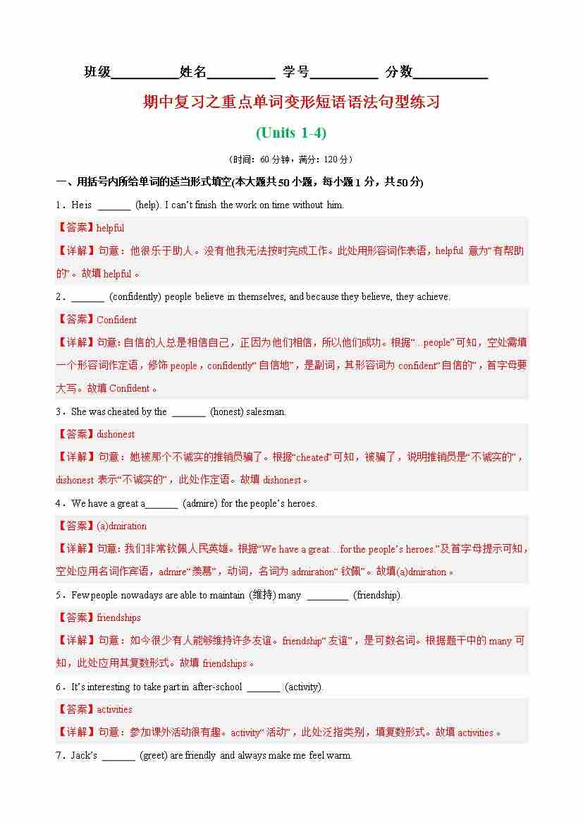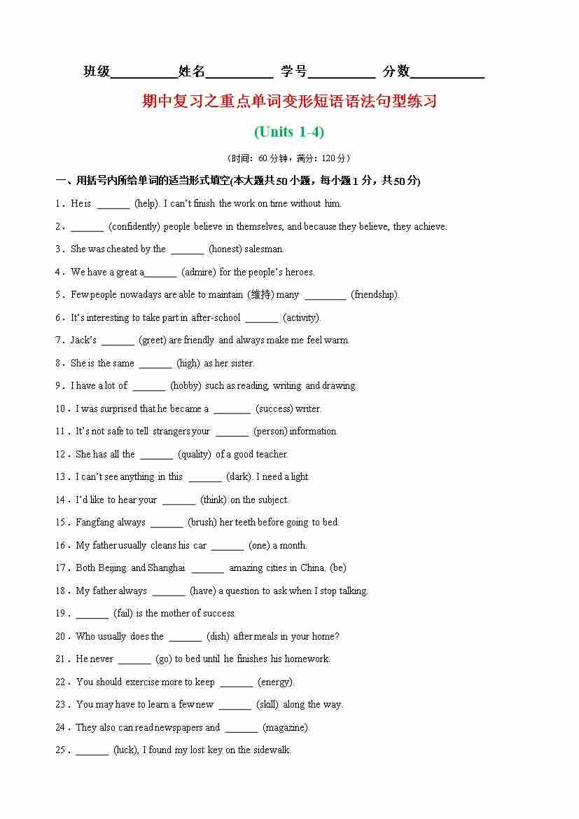 期中复习之重点单词,词性转换,短语,语法,句型练习100题(Units 1-4)(学生版)
