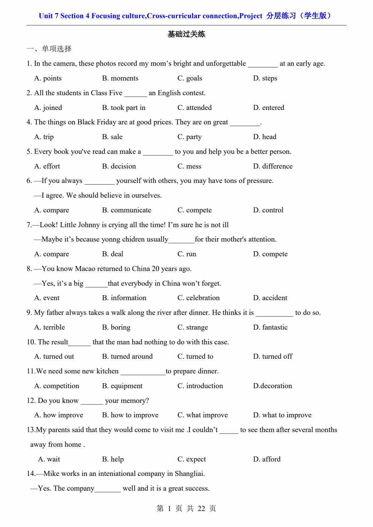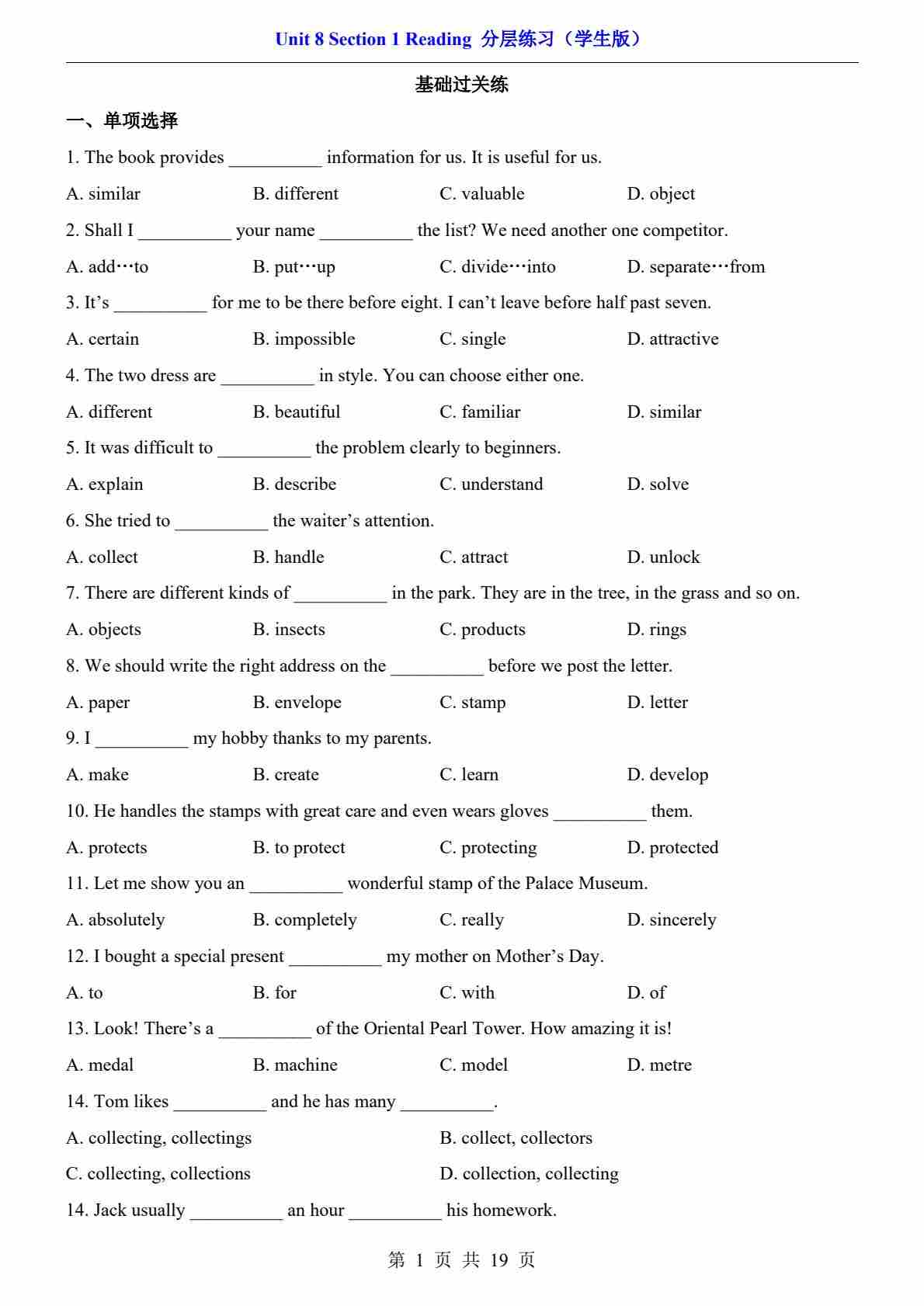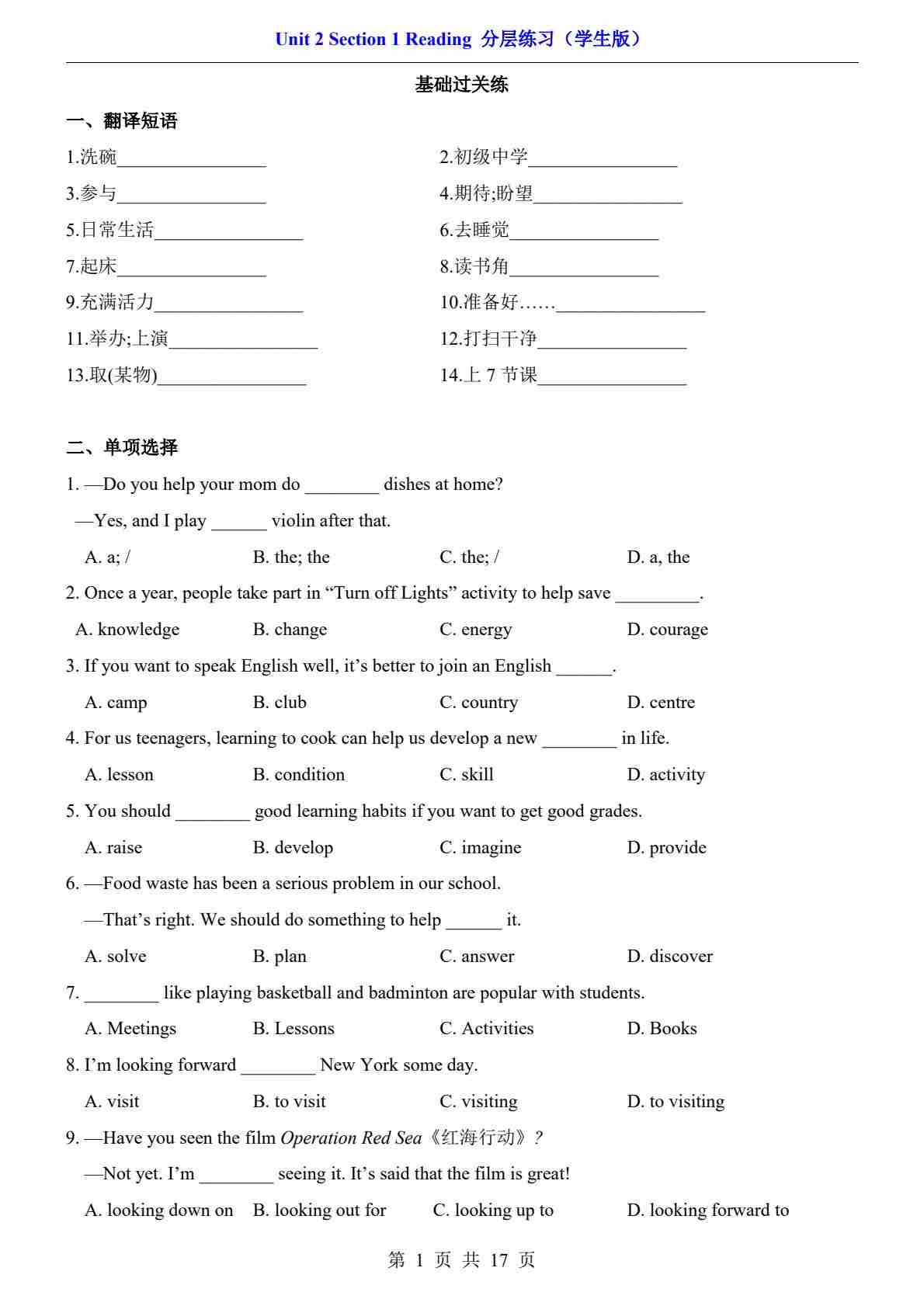 Unit 1 Section 1 Reading(分层练习)沪教版